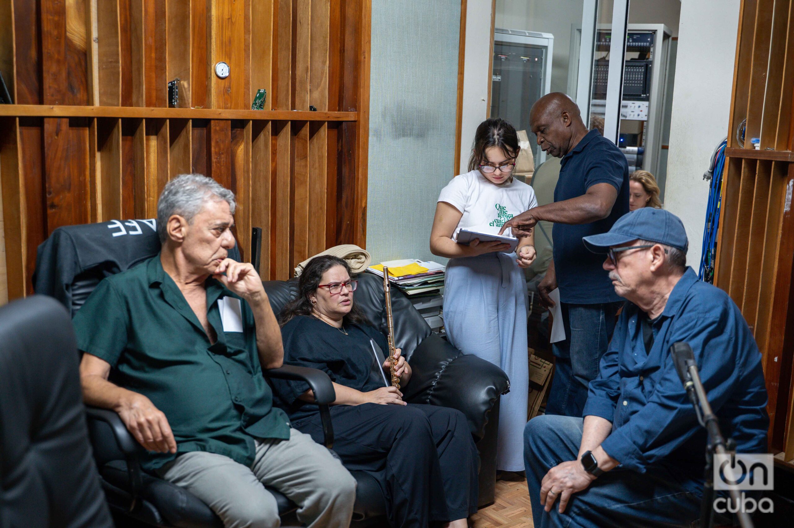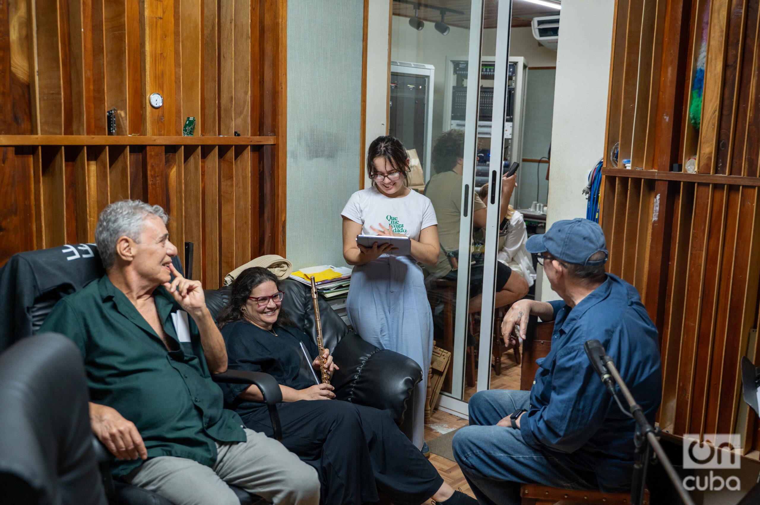 Sesión de trabajo en los Estudios Ojalá. Chico, Niurka, Malva y Jorge Reyes. Foto: Kaloian.