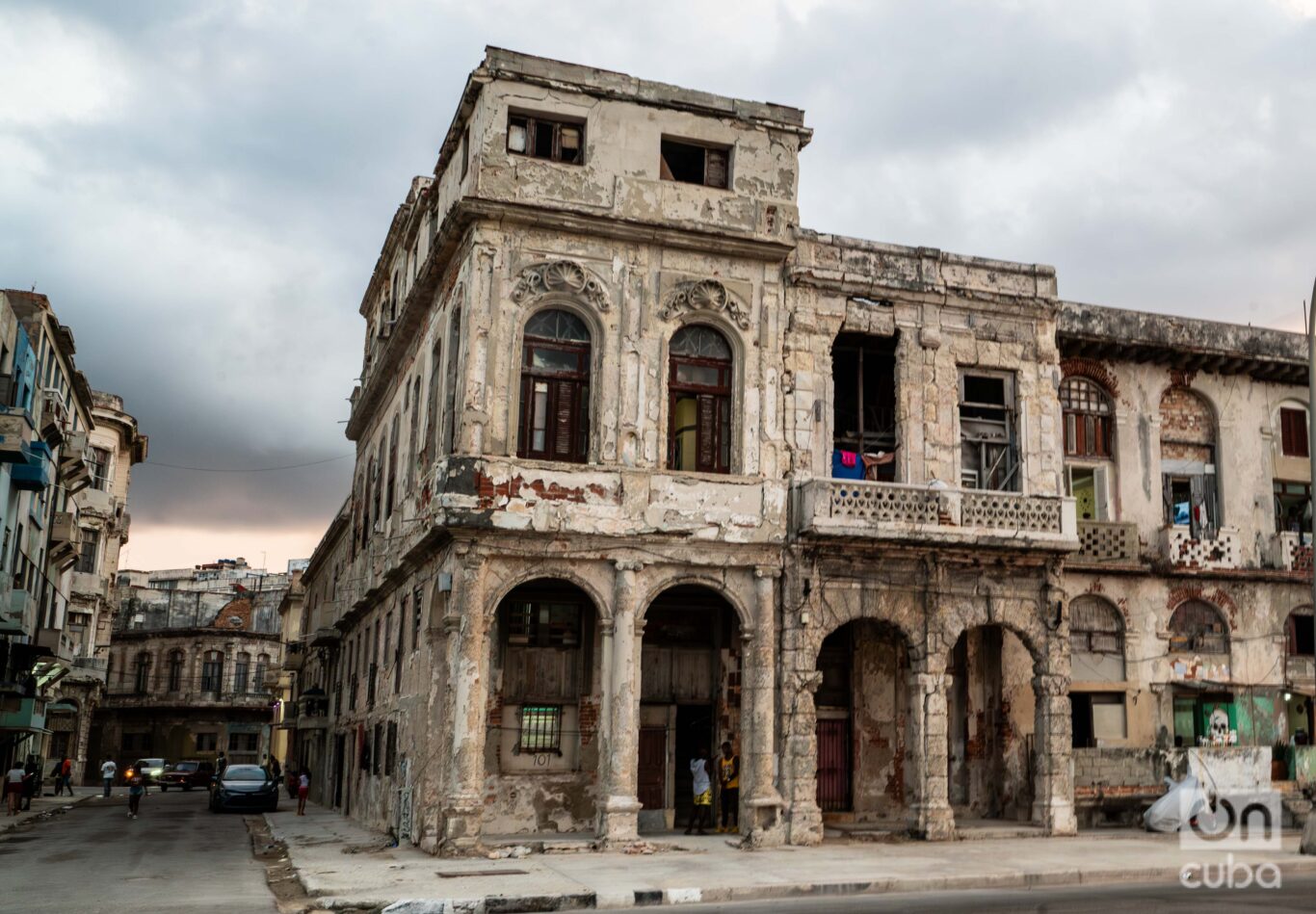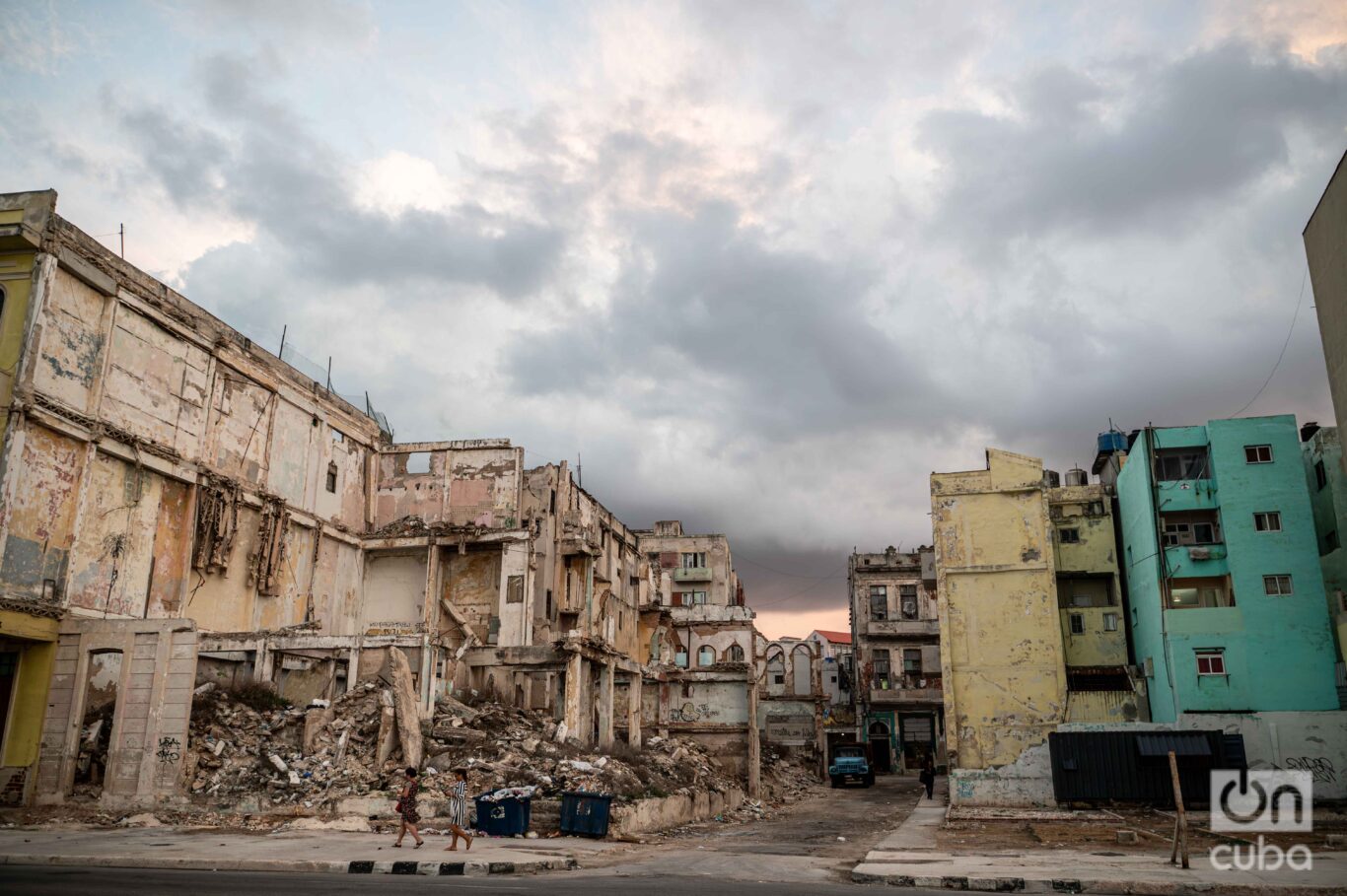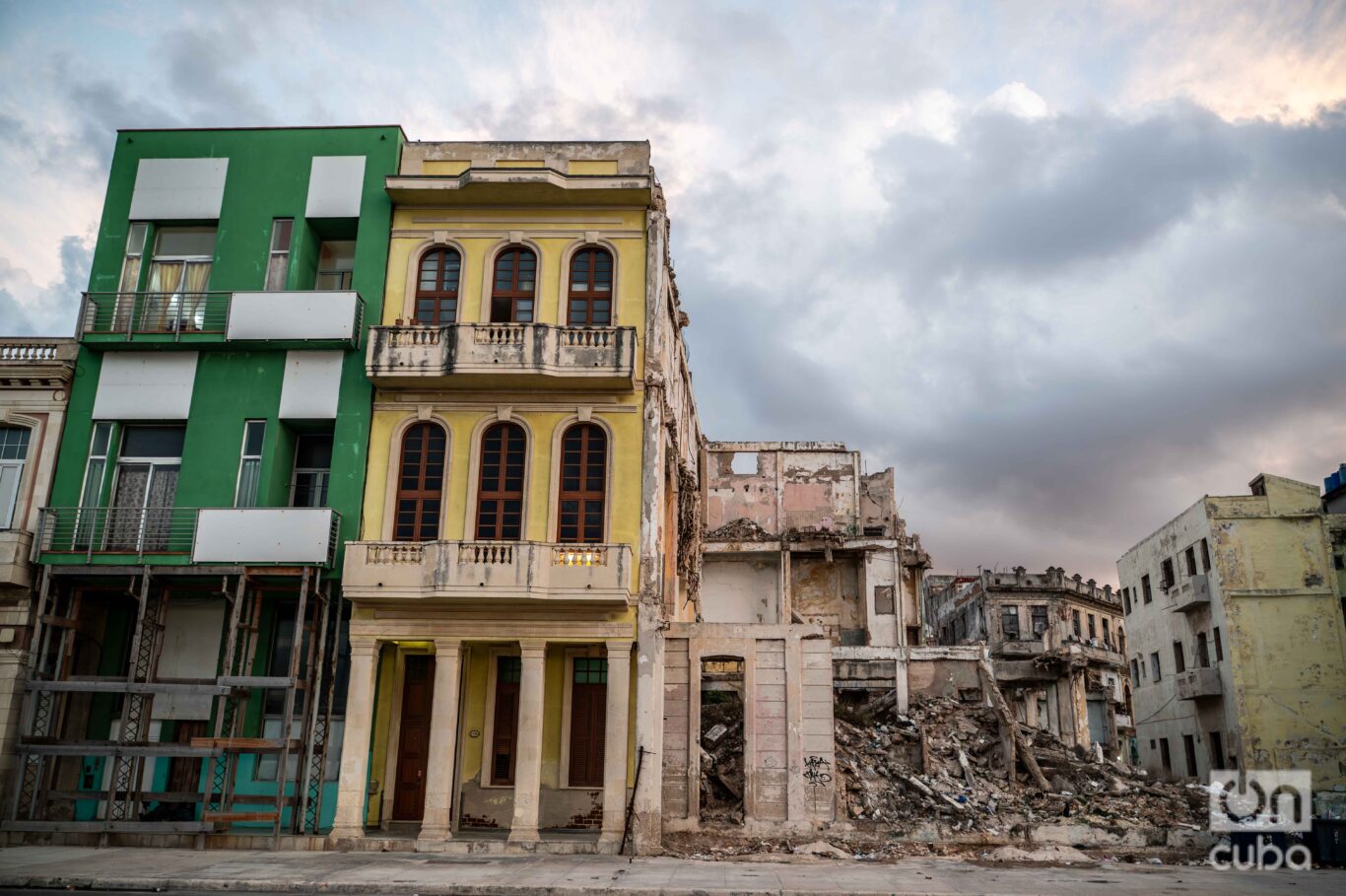Enfrente, como un espejo inevitable, la ciudad se abre: edificios que ya no disimulan su agotamiento, balcones vencidos, escaleras que parecen sostenerse más por memoria que por estructura. Cada cuadra de ese tramo del Malecón trae su propio derrumbe, su propio montón de escombros, su propio basural —que ya no es excepción, sino paisaje. La crisis —económica, material, cotidiana— no se insinúa: se impone. Está ahí, expuesta, en la piel de las cosas.