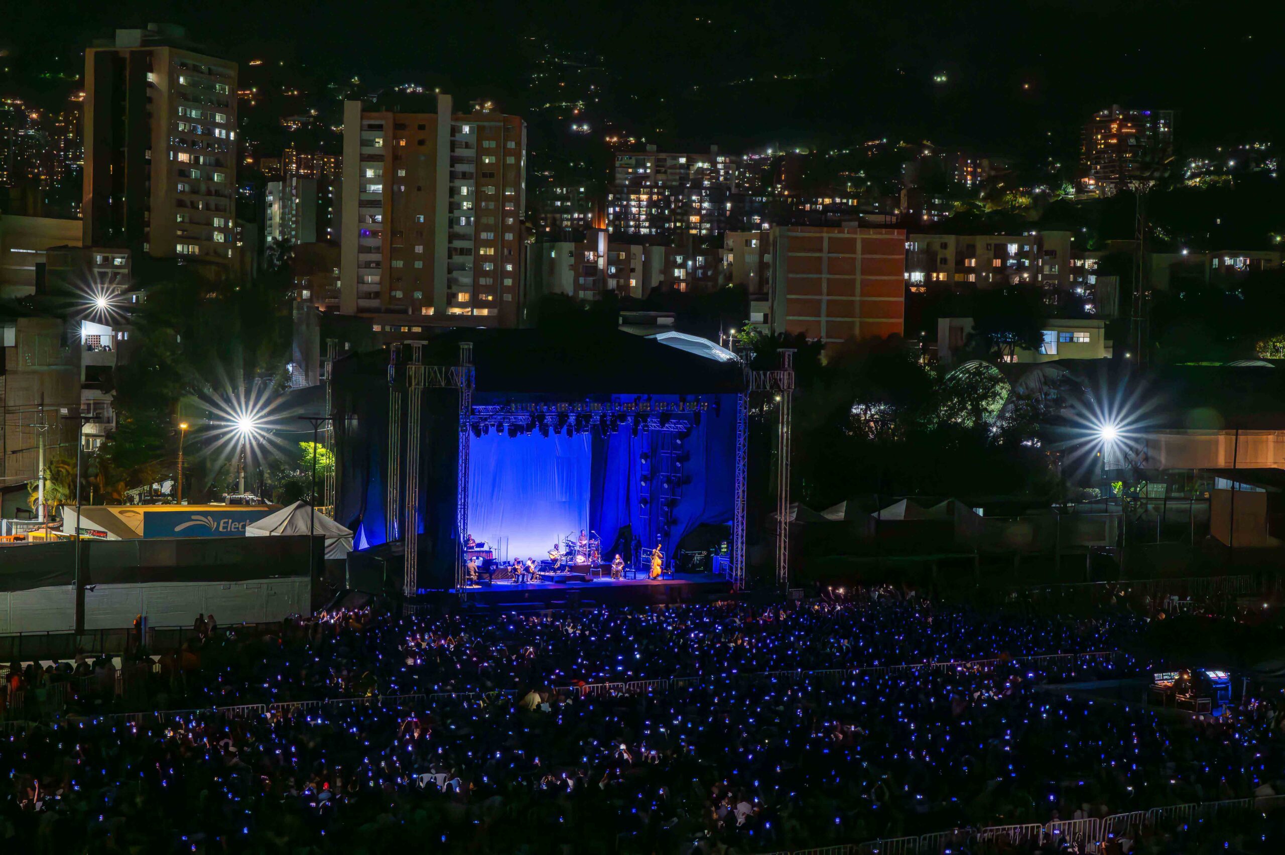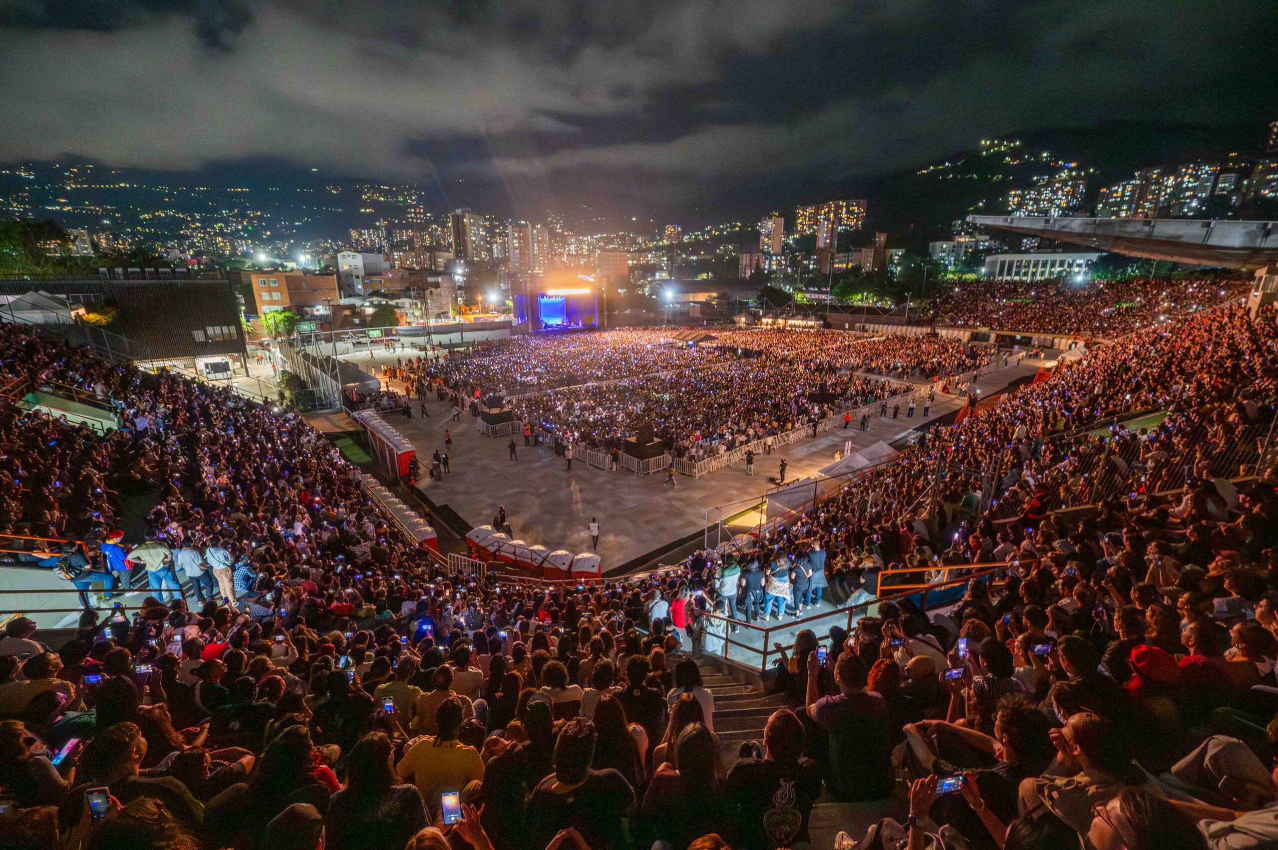 Desde las gradas más altas, el escenario se veía como un punto luminoso rodeado de una escenografía natural de montañas y luces dispersas que parecían luciérnagas bajo un cielo encapotado: una postal viva, de pinceladas cortas y vibrantes, como un cuadro impresionista.