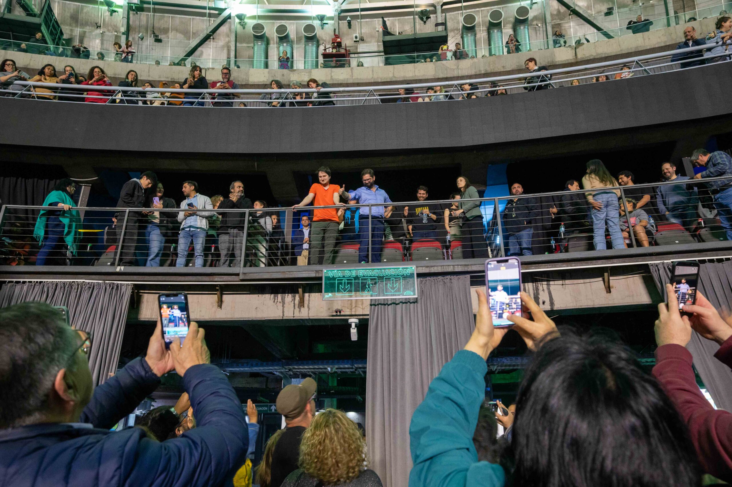 Llegó sin escoltas visibles, sin protocolos, mezclado entre la gente. Se ubicó en el primer balcón frente al escenario. Al reconocerlo, el público lo ovacionó y coreó: “¡Boric, amigo, el pueblo está contigo!”