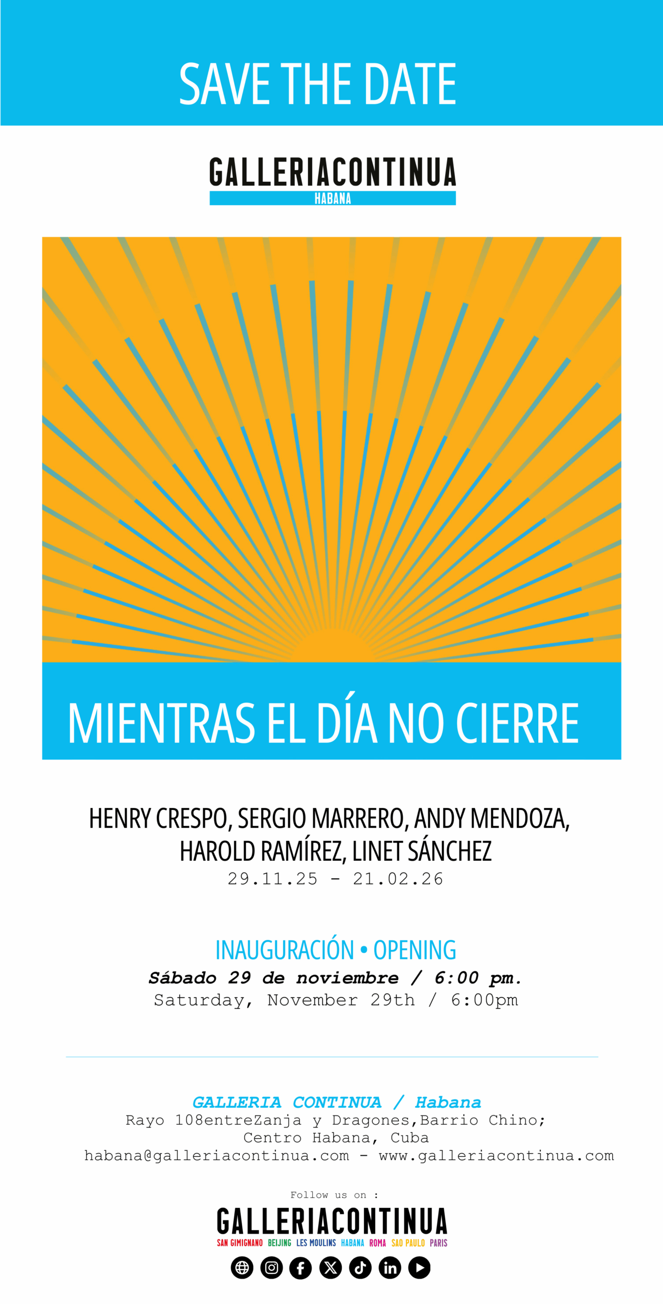 Galleria Continua / Habana inaugurará Mientras el día no cierre, una muestra colectiva que reúne las obras de Henry Crespo, Sergio Marrero, Andy Mendoza, Harold Ramírez y Linet Sánchez. La exposición abrirá al público este sábado 29 de noviembre, a las 6:00 p.m., en la sede de la galería ubicada en el Barrio Chino.