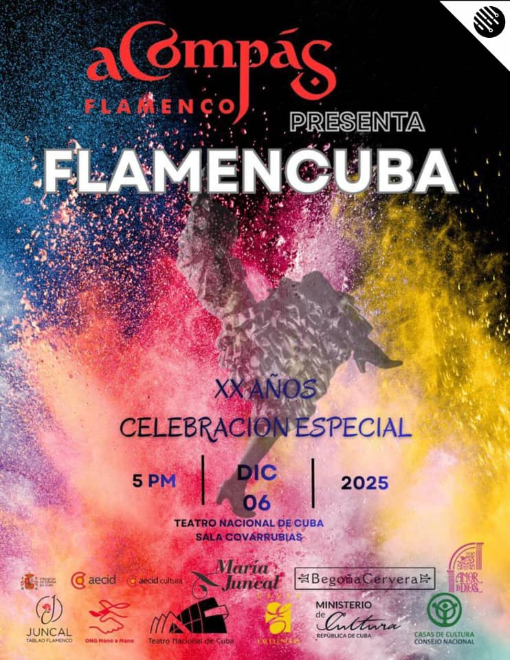 Flamencuba celebra los 20 años de la compañía A Compás Flamenco con un espectáculo que mezcla raíces, fuerza y puro duende a la cubana. Este viaje de palmas, zapateo y emoción que honra dos décadas de trabajo y pasión sobre los escenarios tendrá lugar este sábado 6 de diciembre, a las 5:00 p.m.