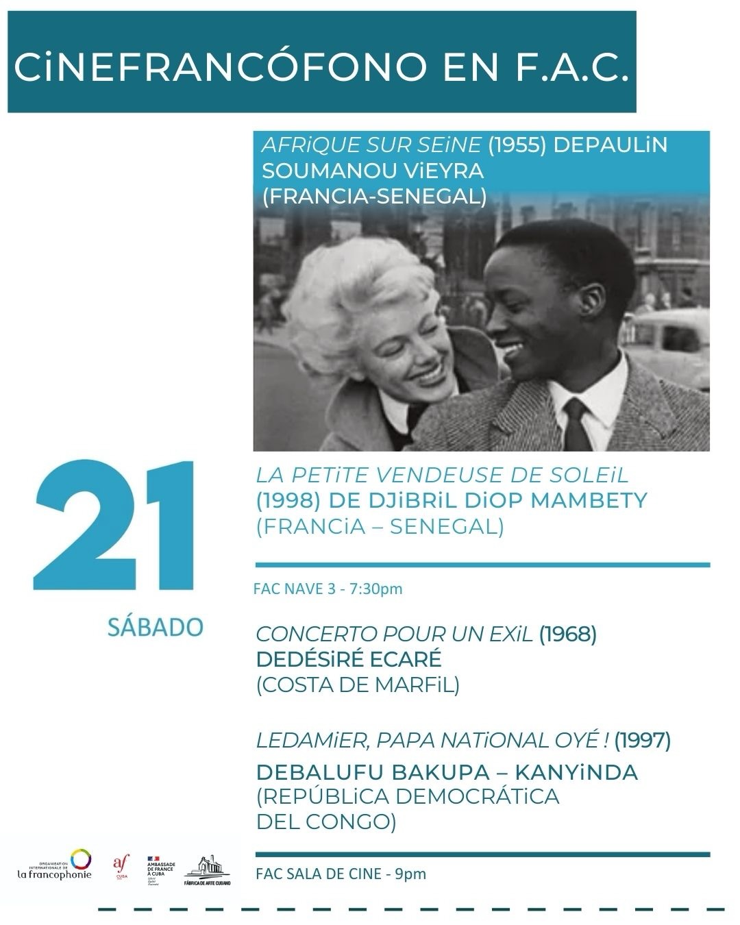 El programa incluye un ciclo de cine francófono este sábado 21 de marzo, a las 7:30 p.m. y 9:00 p.m., en la Fábrica de Arte Cubano, con una selección de obras que exploran miradas diversas y narrativas que cruzan fronteras.