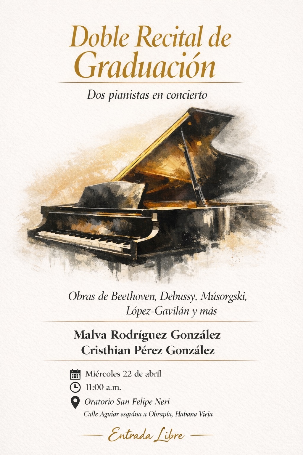 Los jóvenes pianistas cubanos Malva Rodríguez González y Cristhian Pérez González ofrecerán un concierto en el Oratorio San Felipe Neri este miércoles 22 de abril a las 11am con entrada libre al público.