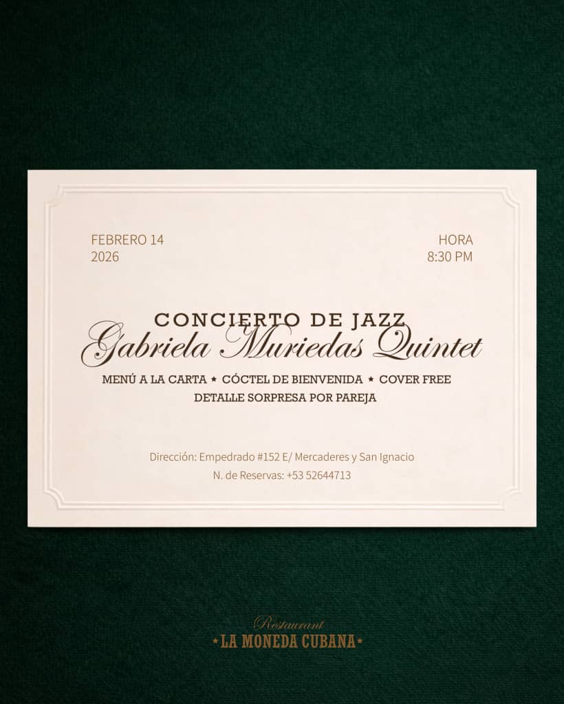 Gabriela Muriedas Quintet ofrecerá un concierto de jazz este sábado 14 de febrero, a las 8:30 p.m., en La Moneda Cubana. La noche propone un plan completo para compartir: cena a la carta, cóctel de bienvenida y un detalle sorpresa por pareja, en un ambiente íntimo en pleno corazón de La Habana Vieja.