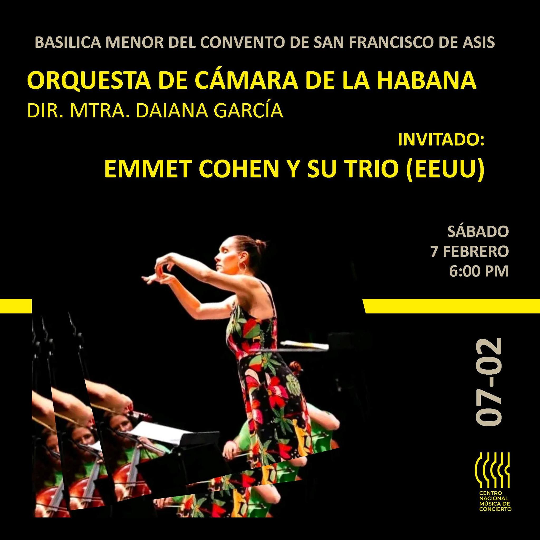 La Orquesta de Cámara de La Habana, bajo la dirección de la maestra Daiana García Siverio, ofrecerá un concierto especial junto a su invitado, el reconocido pianista estadounidense Emmet Cohen y su trío, este sábado 7 de febrero, a las 6:00 p.m., en la Basílica Menor y Convento de San Francisco de Asís.