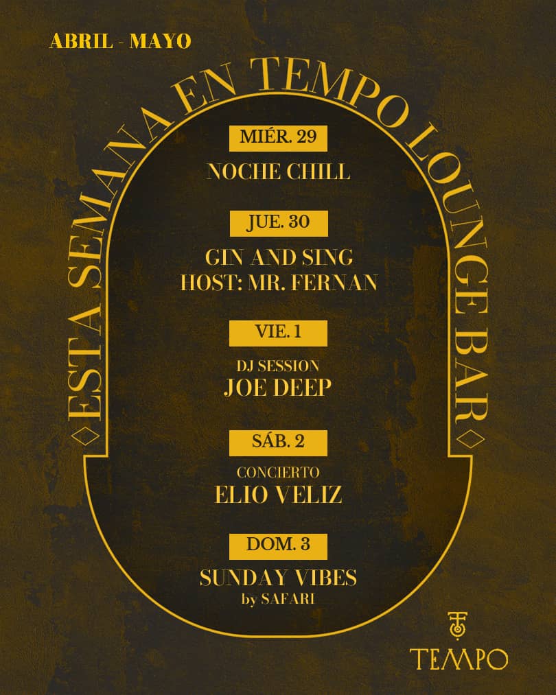 Tempo Lounge Bar presenta una nueva semana de programación con propuestas que combinan música, entretenimiento y ambiente nocturno. La agenda propone hoy jueves 30 Gin & Sing, conducido por Mr. Fernan; el viernes 1 de mayo llega una sesión de DJ con Joe Deep; el sábado 2 se presenta en concierto Elio Veliz; y el domingo 3 cierra la semana Sunday Vibes by Safari.