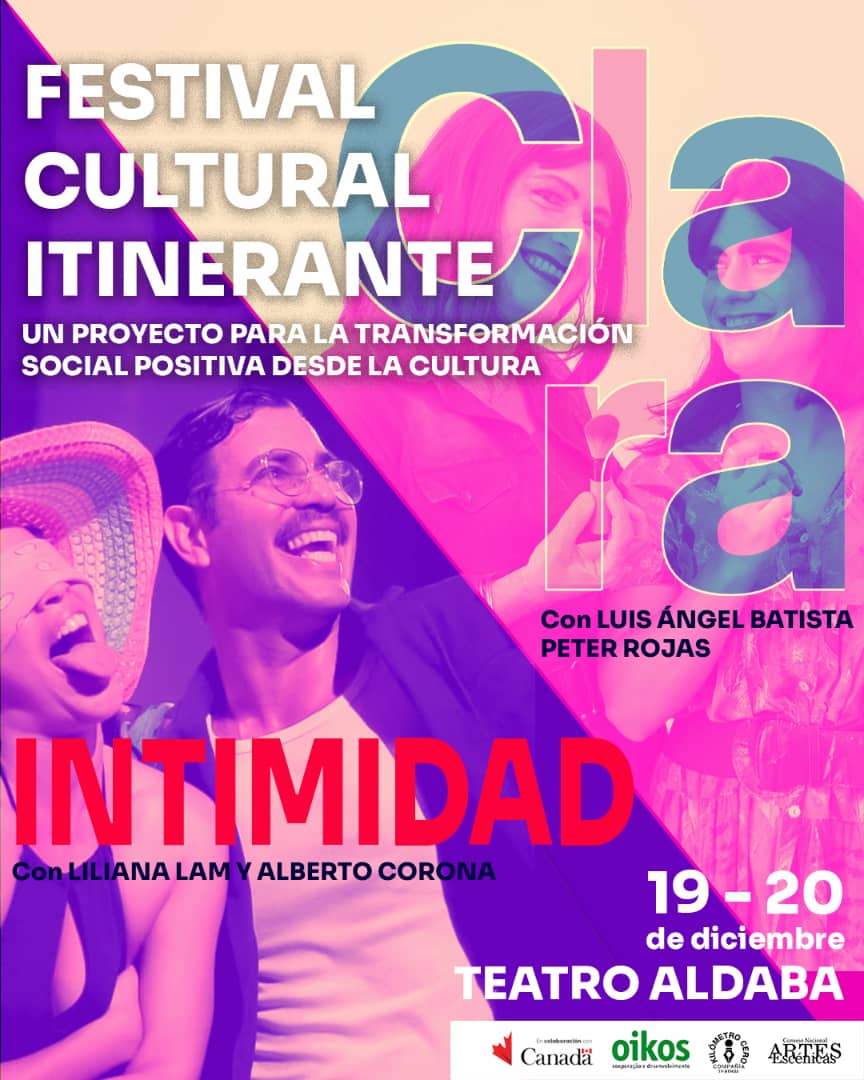 El Festival Cultural Itinerante llega al Teatro Aldaba este viernes 19 y sábado 20 de diciembre, en Marianao, con dos propuestas teatrales que apuestan por la cultura como motor de transformación social. En cartelera estarán Clara, con Luis Ángel Batista y Peter Rojas, e Intimidad, con Liliana Lam y Alberto Corona.