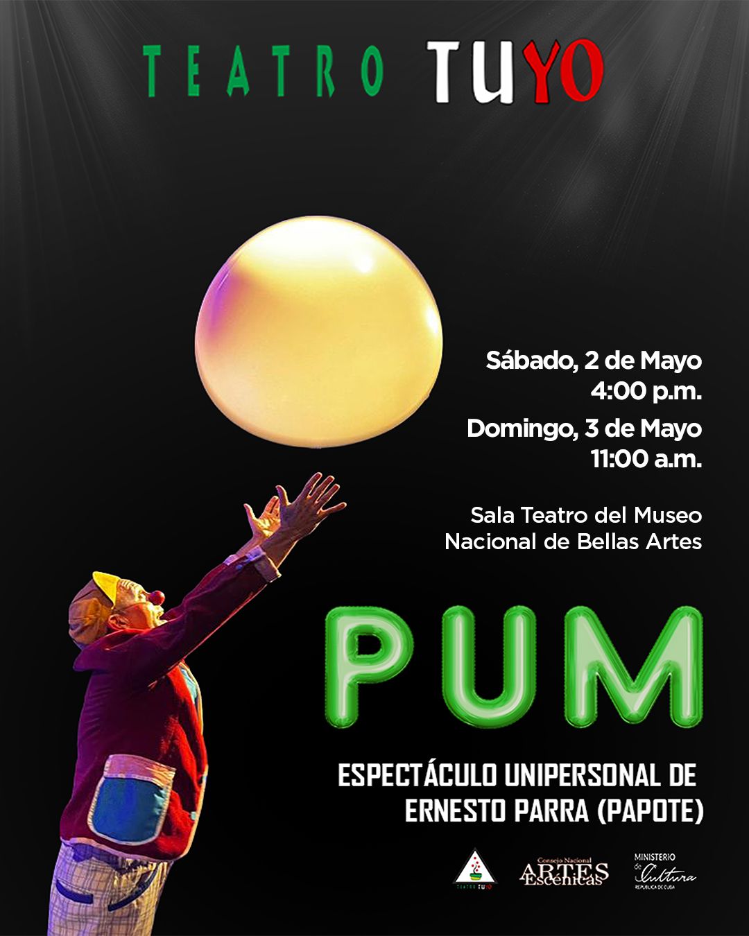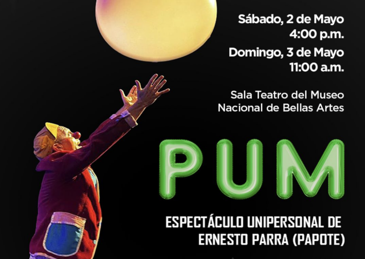 Teatro Tuyo presenta PUM, una obra protagonizada por Ernesto Parra (Papote), quien lleva a escena un espectáculo donde la emoción y el lenguaje del clown se convierten en el centro de la experiencia. Las funciones tendrán lugar el sábado 2 de mayo, a las 4:00 p.m., y el domingo 3 de mayo, a las 11:00 a.m., en la Sala Teatro del Museo Nacional de Bellas Artes.