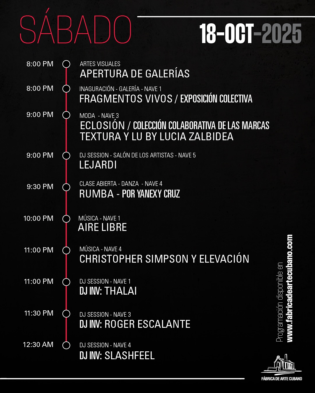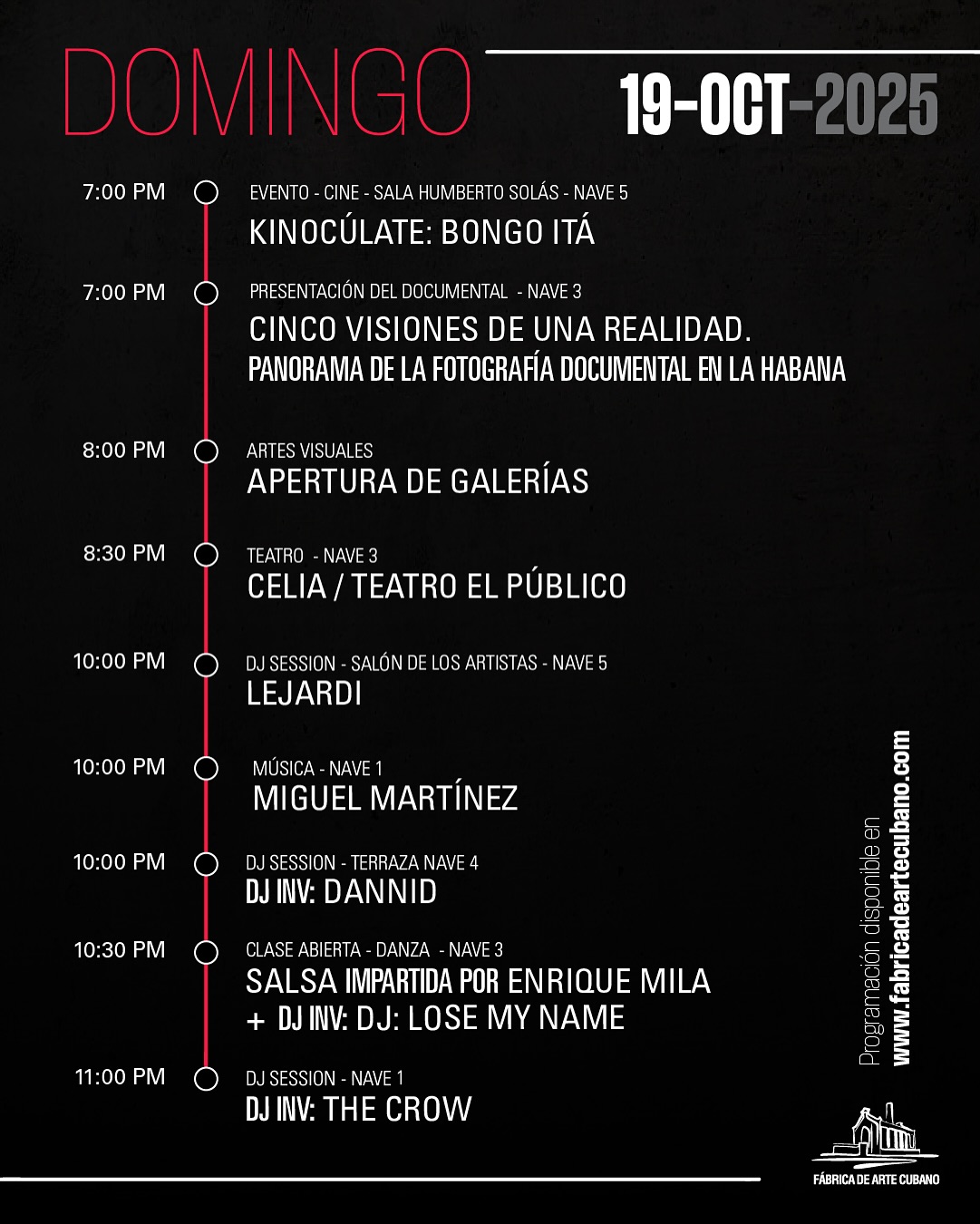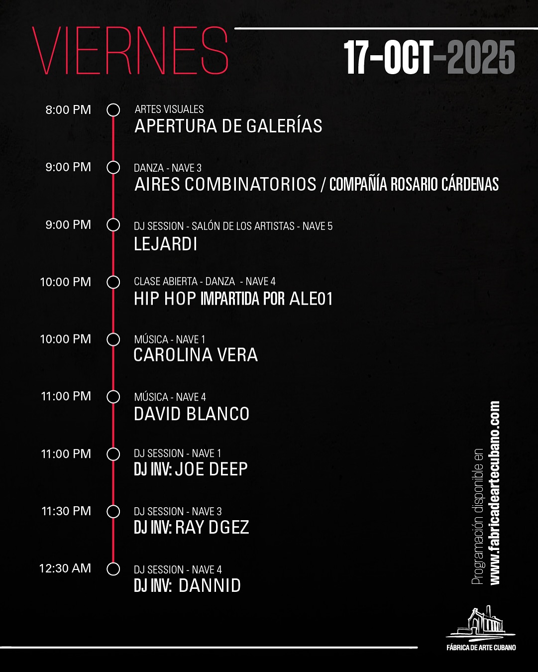 Para cerrar como cada semana, te dejamos la programación de la Fábrica de Arte Cubano para estos tres días. Ya ves que la ciudad está vibrando con propuestas diversas y llenas de talento, así que solo tienes que elegir tu plan y salir a disfrutar de lo mejor del arte y la cultura cubana. Síguenos también en nuestra página de Facebook para que no pierdas la Ruta.