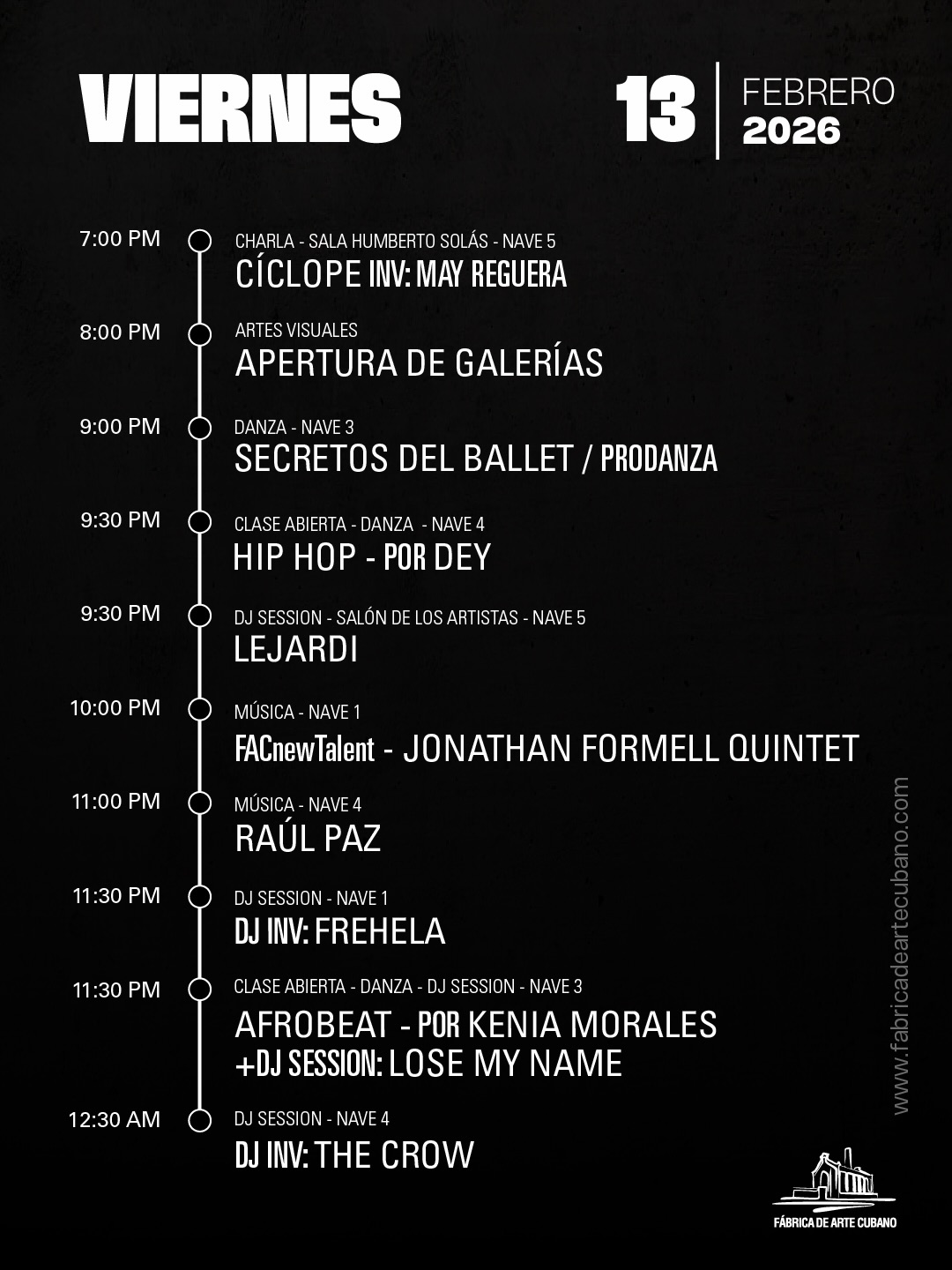 Cuándo: Viernes 13 de febrero, 8:00 p.m. (apertura)