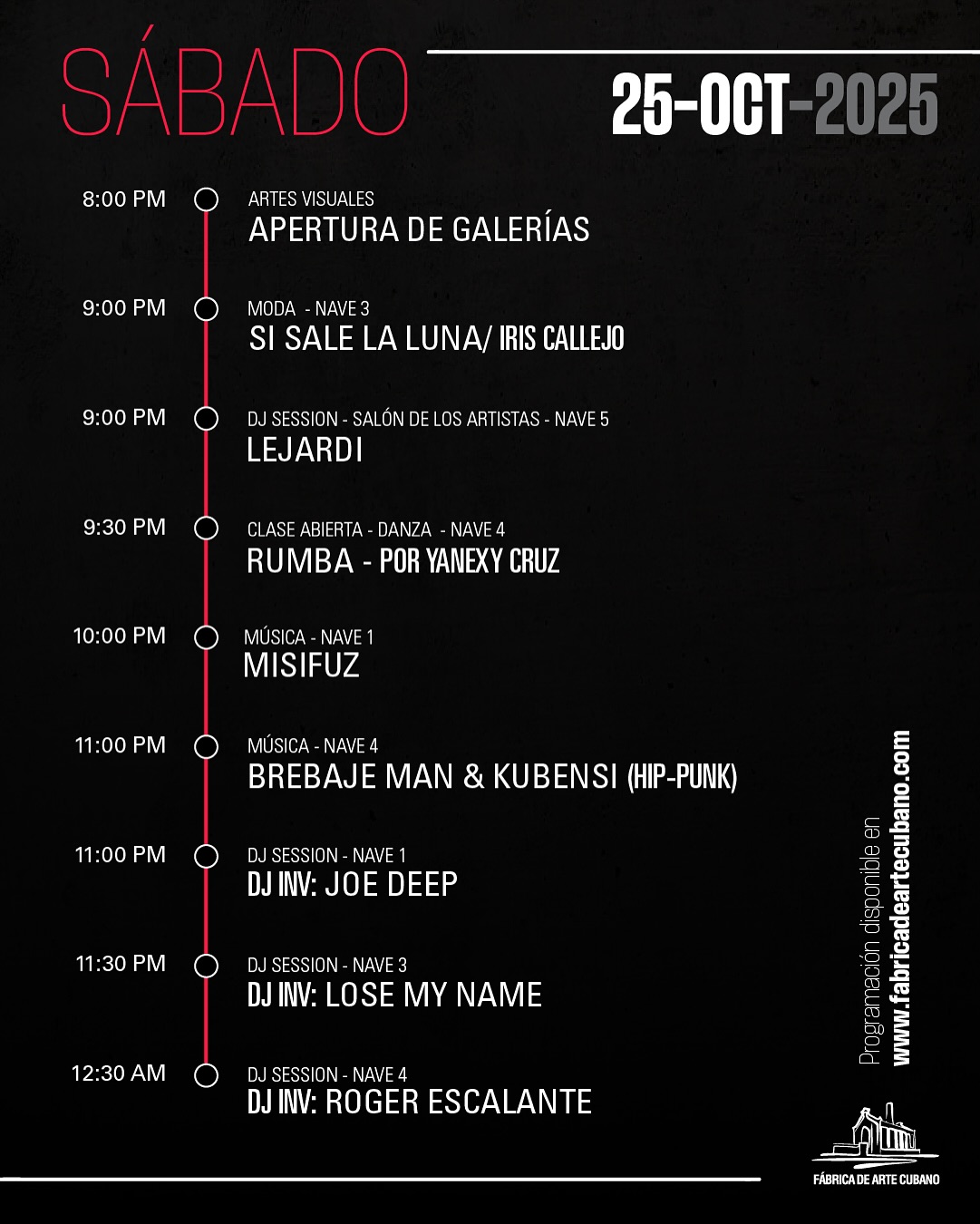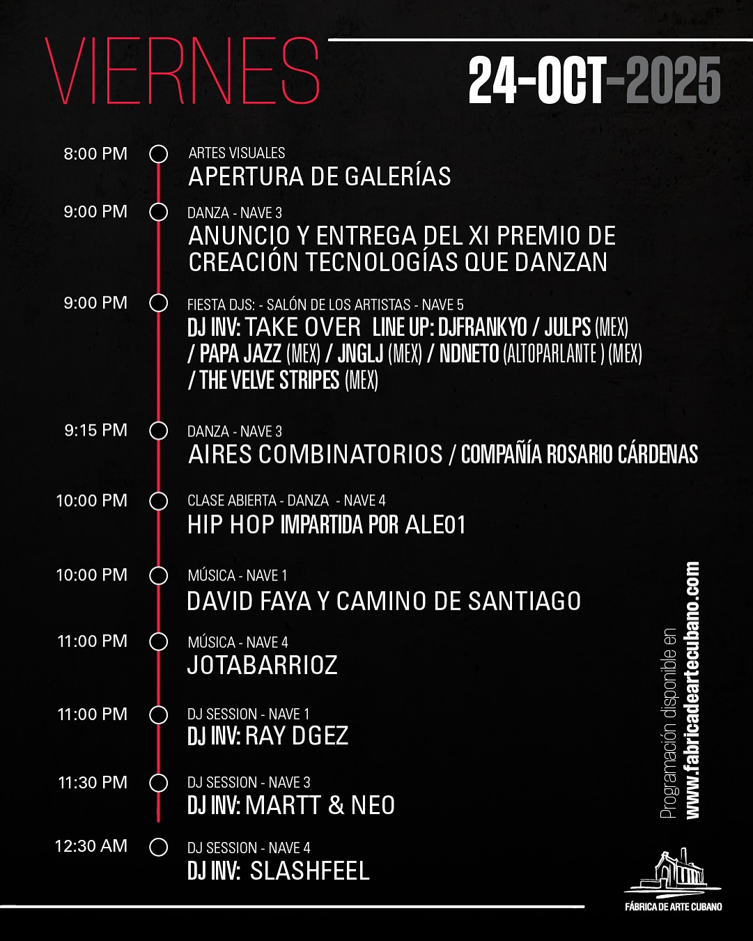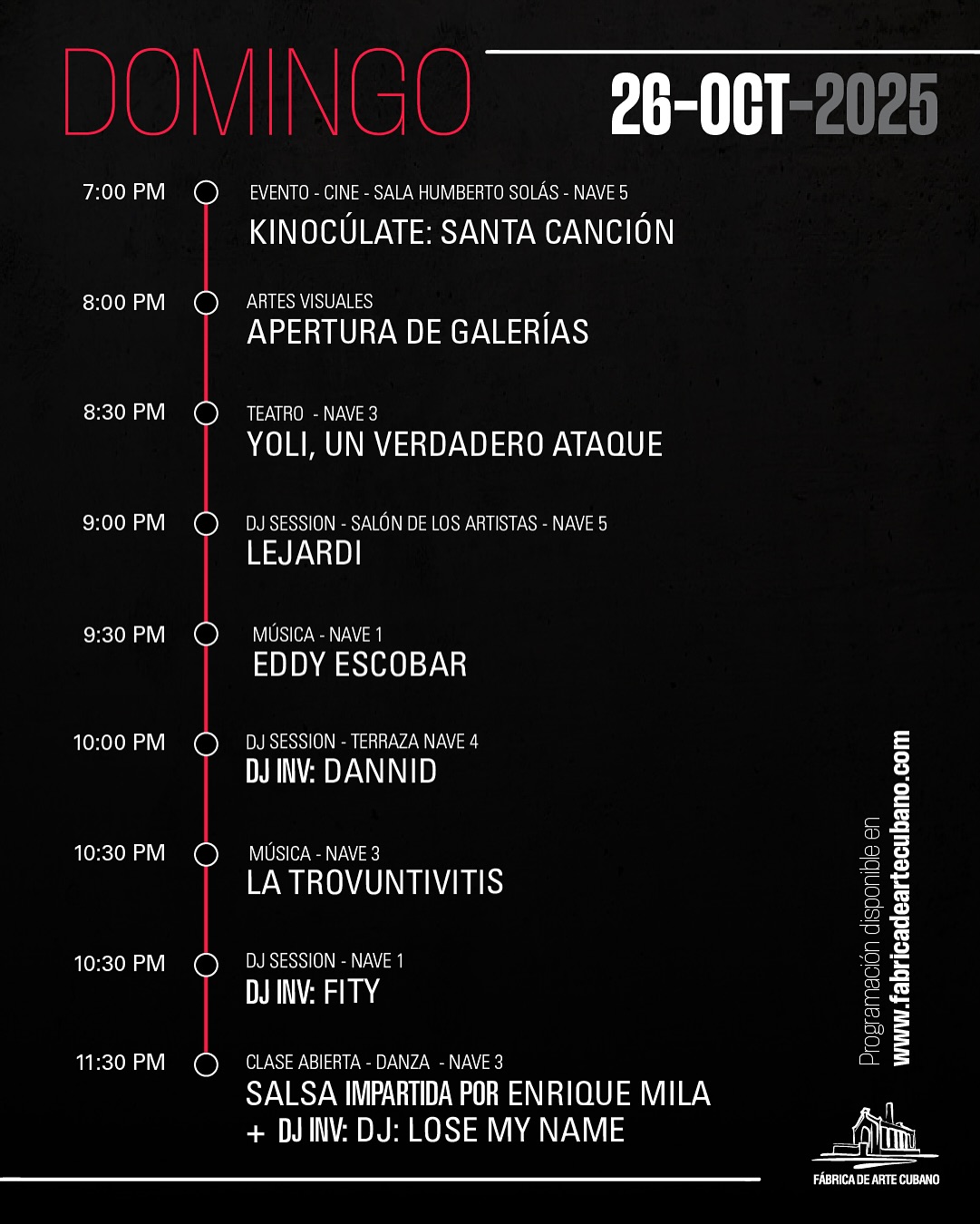 Ya por último, te dejamos la programación de la Fábrica de Arte Cubano para estos tres días. Ahora te toca elegir tu plan y disfrutar de lo mejor del arte y la cultura cubana. Síguenos cada día en nuestra página de Facebook para que no pierdas la Ruta.