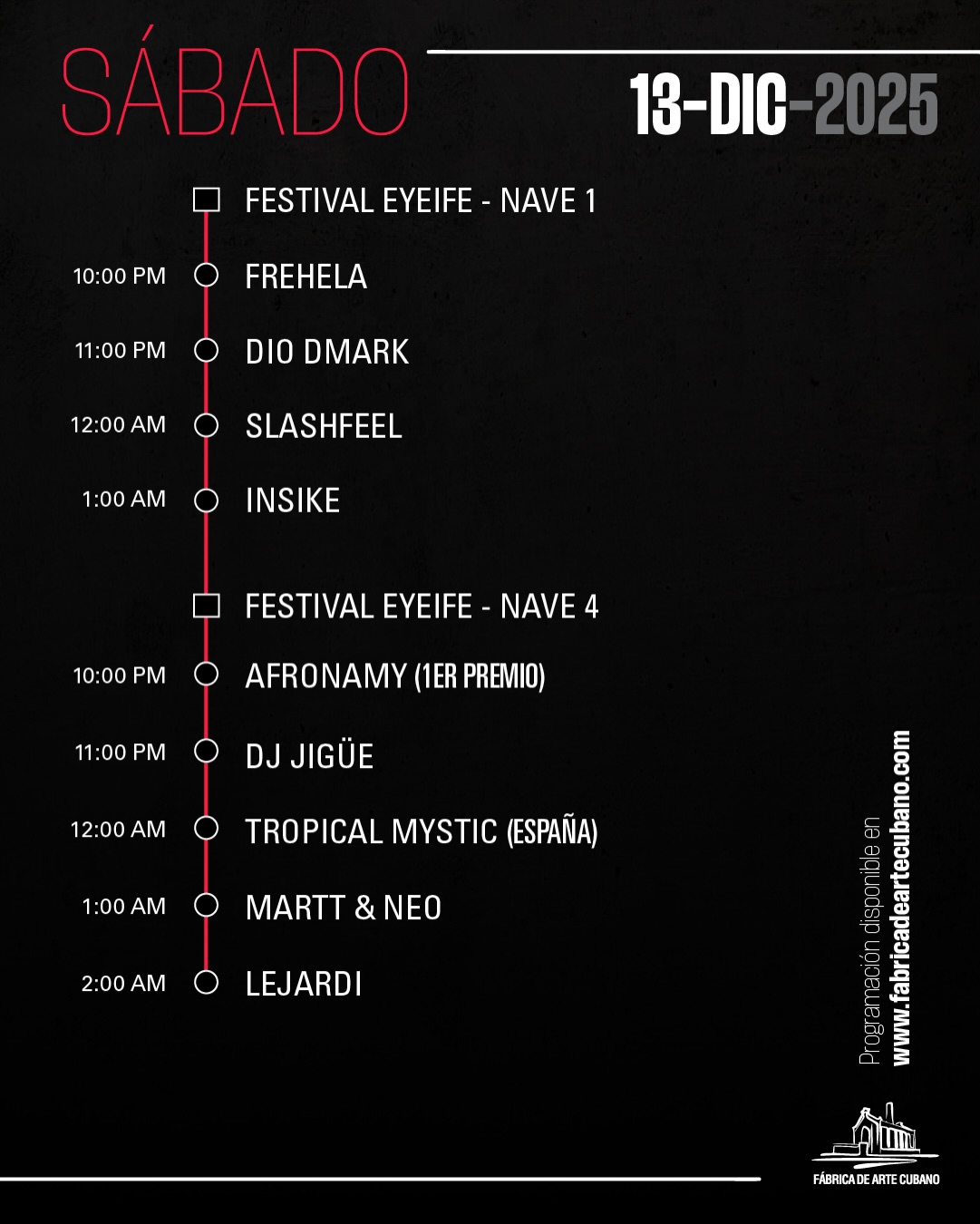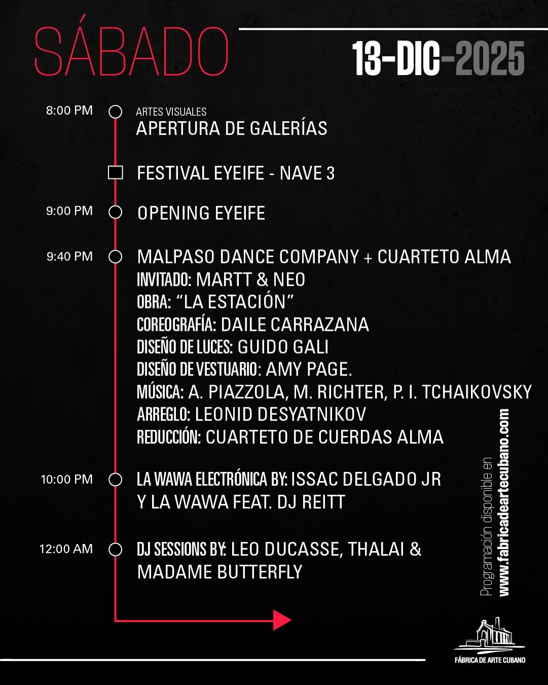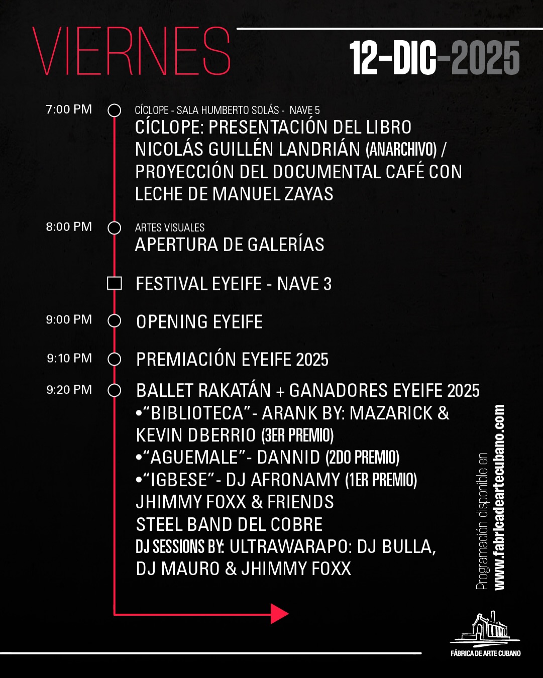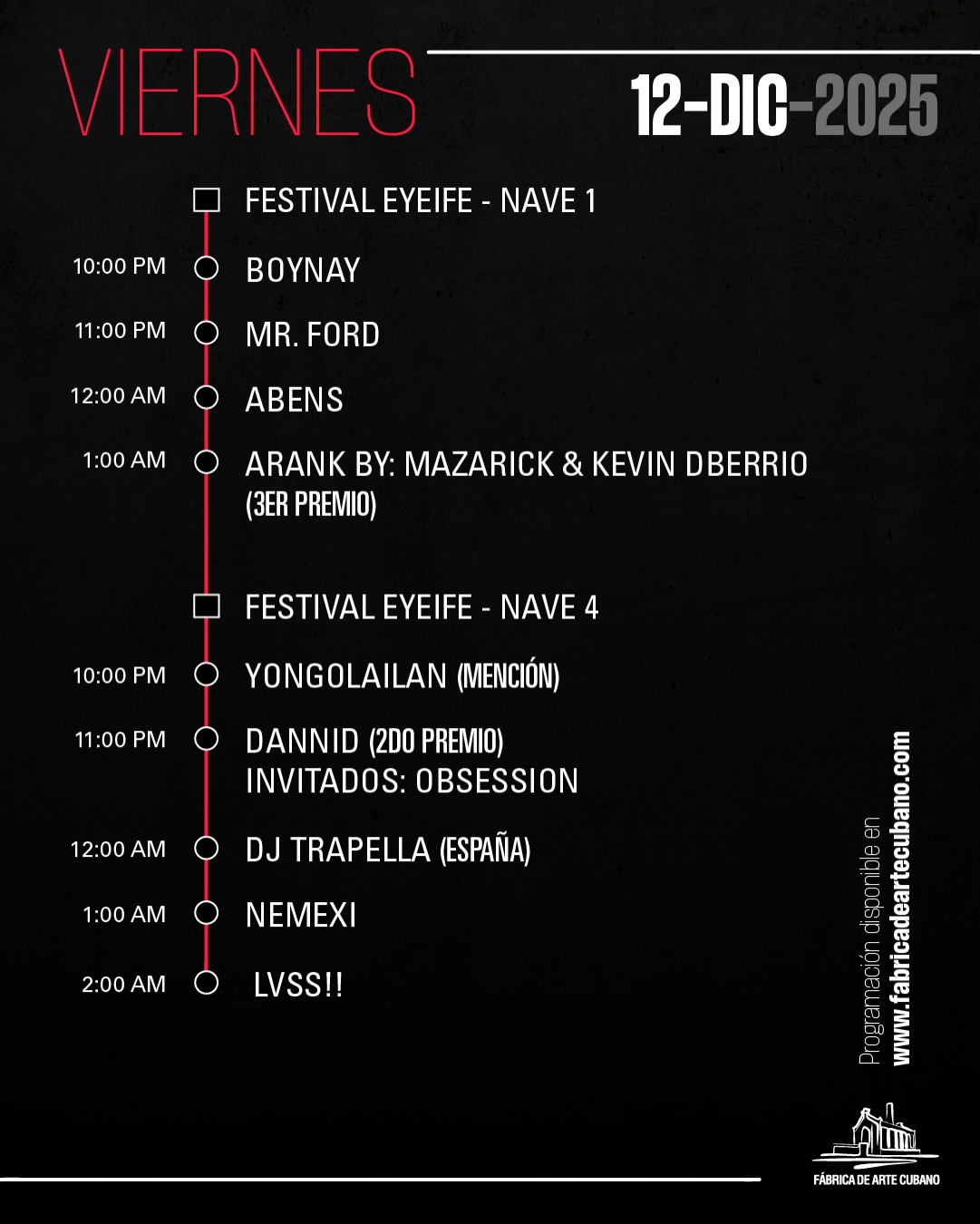 El Festival Eyeife presenta su novena edición hasta mañana sábado 13 de diciembre en su sede habitual, Fábrica de Arte Cubano (FAC), con un programa que reune a Djs cubanos y españoles, agrupaciones danzarias y colaboraciones especiales.