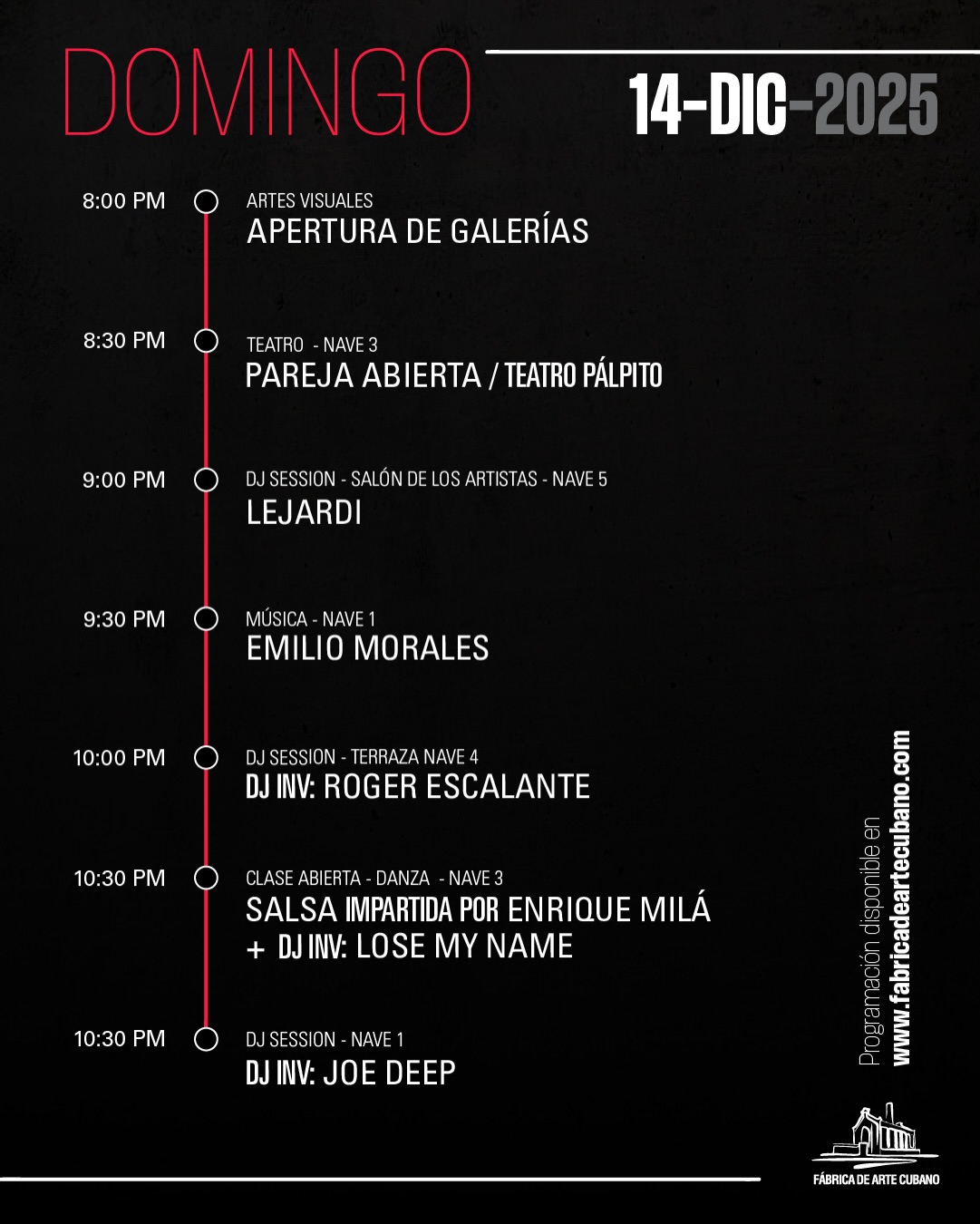 Y para reír, llega la celebración del aniversario del Teatro Karl Marx con el show humorístico ¿De boca para afuera?, que reúne a grandes figuras del humor cubano. Y, por supuesto, no faltan las propuestas de Fábrica de Arte Cubano.