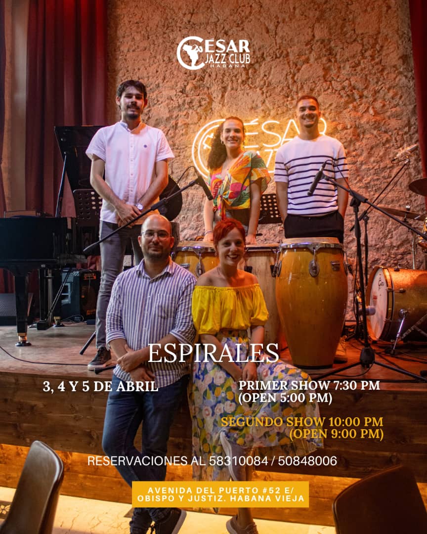 El César Jazz Club presenta su programación para este fin de semana que tendrá desde hoy viernes 3 al domingo 5 de abril, a la agrupación Espirales. Cada jornada contará con dos funciones: el primer show a las 7:30 p.m. (apertura desde las 5:00 p.m.) y el segundo a las 10:00 p.m. (apertura desde las 9:00 p.m.).