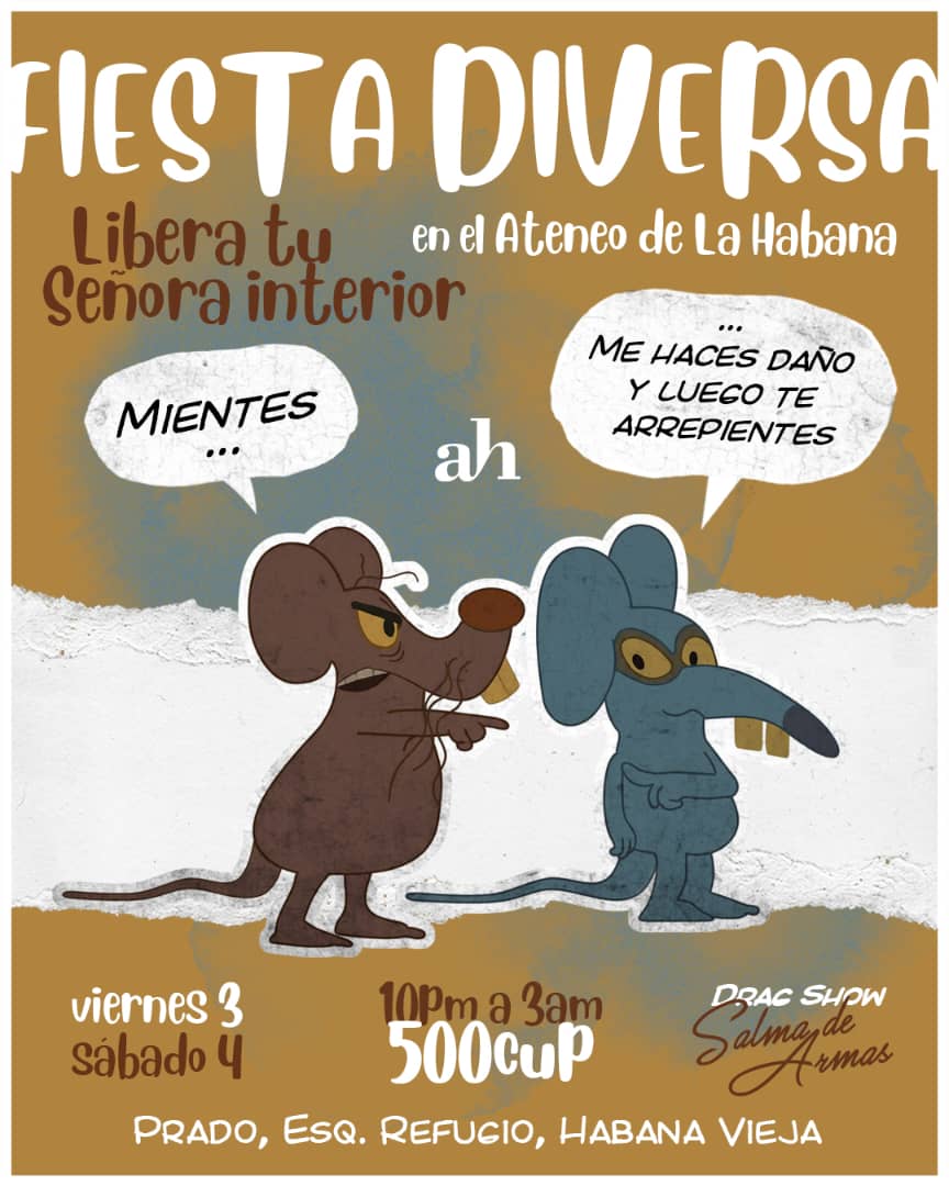 Regresa la Fiesta Diversa al Ateneo de La Habana con dos noches para liberar “tu señora interior”, subir el volumen y bailar sin pedir permiso. Hoy viernes 3 y mañana sábado 4 de abril, de 10:00 p.m. a 3:00 a.m., disfruta de buena música y un drag show a cargo de Salma de Armas.