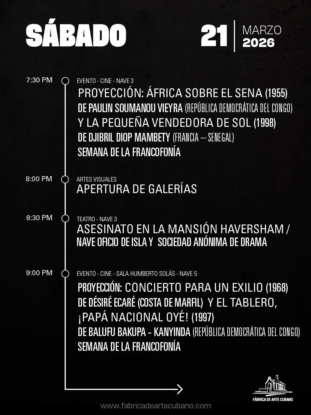 El programa incluye un ciclo de cine francófono mañana sábado 21 de marzo, a las 7:30 p.m. y 9:00 p.m., en la Fábrica de Arte Cubano, con una selección de obras que exploran miradas diversas y narrativas que cruzan fronteras.