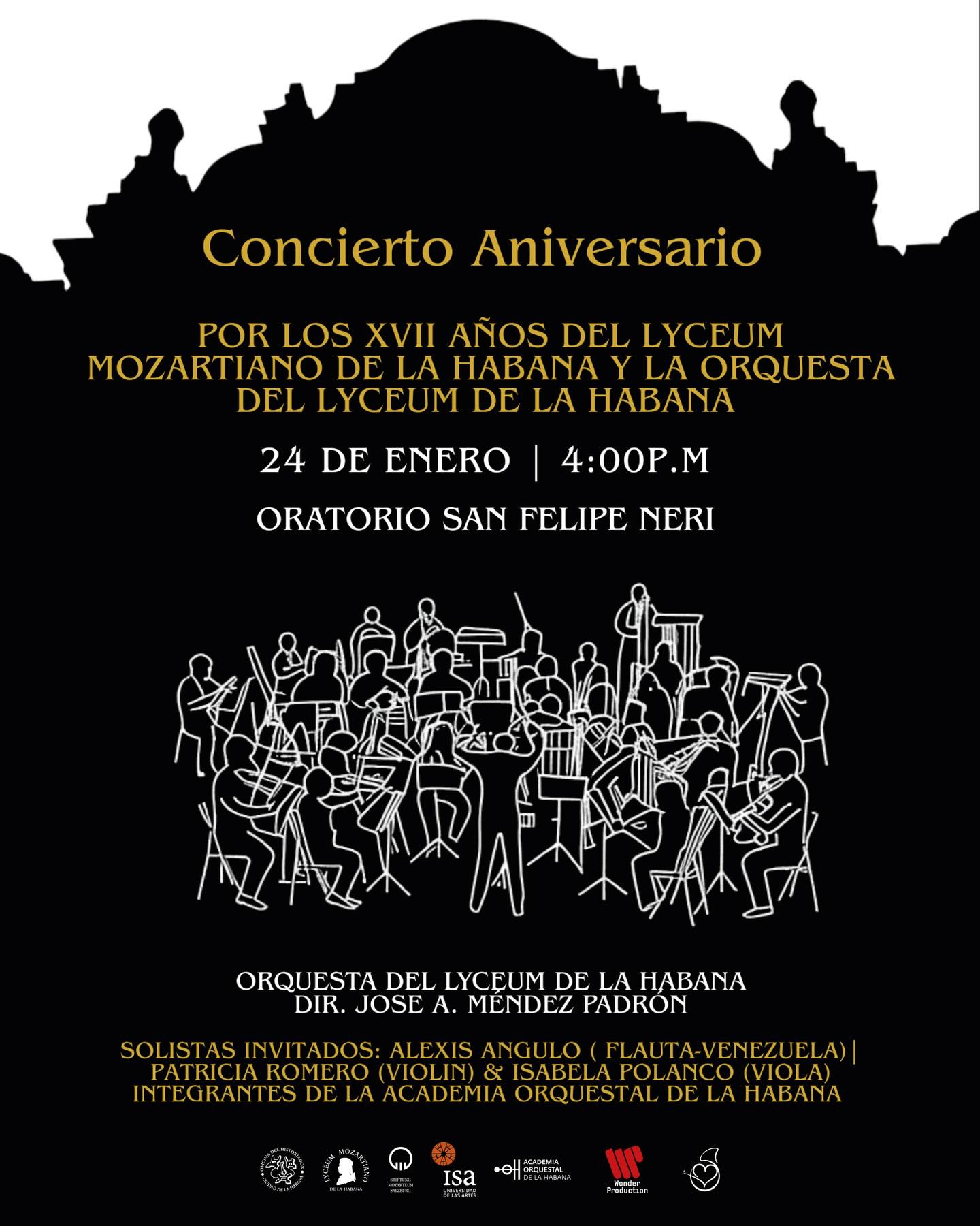 El Lyceum Mozartiano de La Habana y su orquesta celebra su 17 aniversario con un concierto especial este viernes 24 de enero, a las 4:00 p.m. La velada tendrá como eje la Sinfonía n.º 3 Eroica de Ludwig van Beethoven. La celebración se enriquece con invitados especiales: el flautista venezolano Alexis Angulo, solista de la Orquesta Sinfónica Brasileña, y dos jóvenes talentos de la Academia Orquestal de La Habana, Patricia Romero (violín) e Isabela Polanco (viola), quienes interpretarán obras de Wolfgang Amadeus Mozart y Kurt Atterberg.