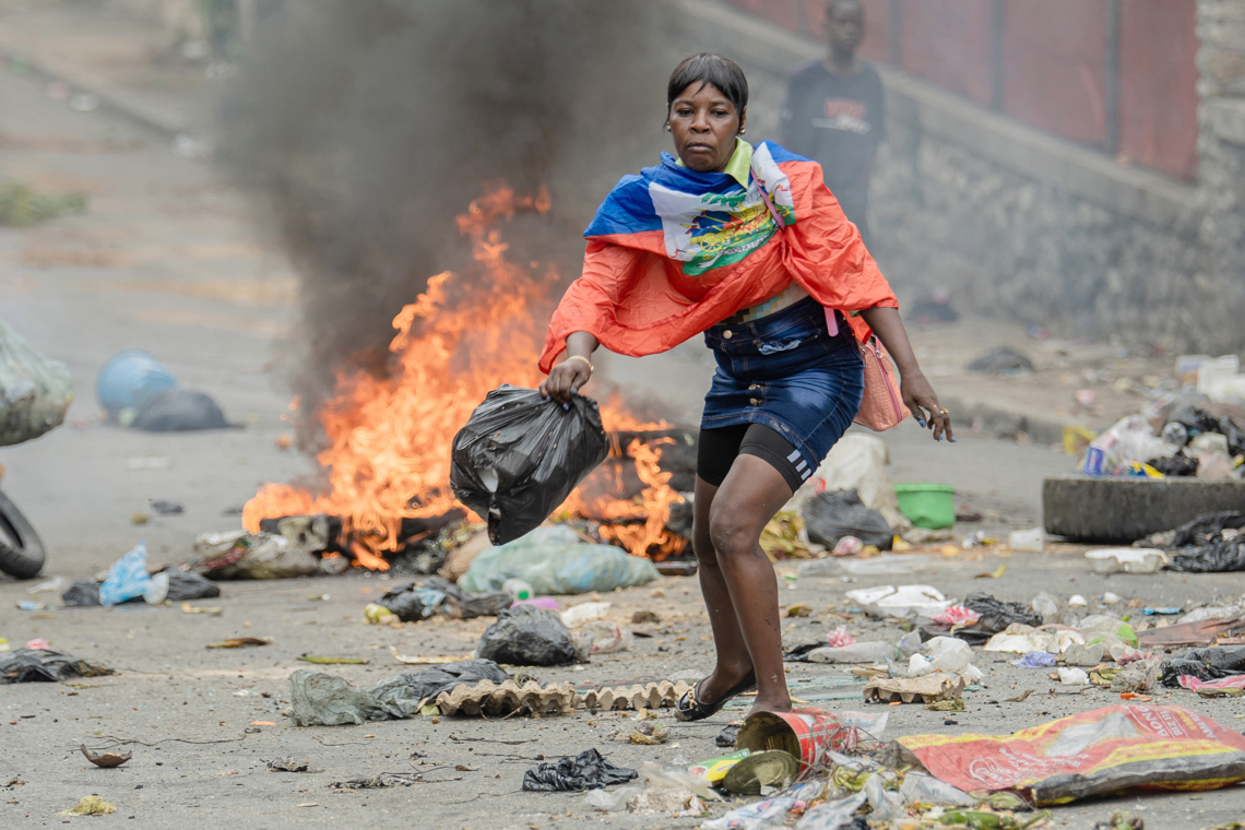 Una mujer camina por una calle bloqueada por manifestantes este viernes, en Puerto Príncipe, Haití. Las lluvias provocadas por la tormenta tropical Melissa han dejado al menos tres muertos, mientras los organismos internacionales intensificaron la movilización de ayuda para tratar de mitigar el impacto en este empobrecido país golpeado por la violencia de las pandillas. Foto: EFE/Mentor David Lorens.