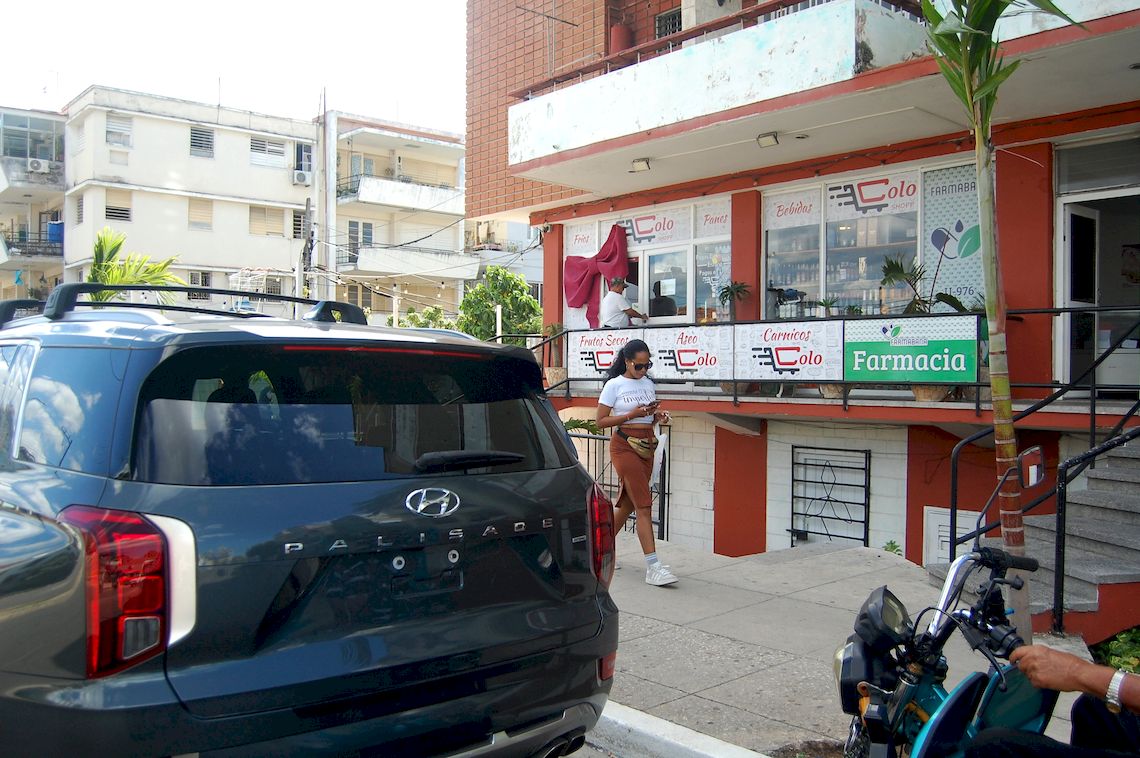 Personas caminan y hacen cola en una Cadeca en el Vedado. Foto: Otmaro Rodríguez.