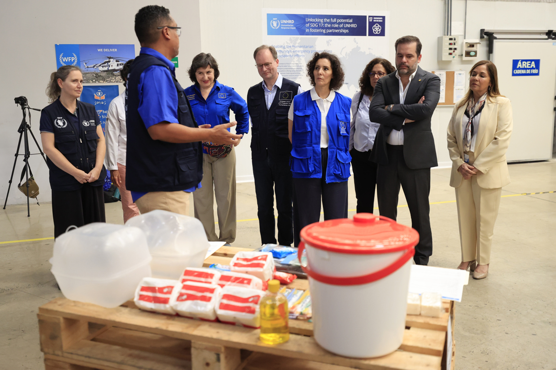 La comisionada europea de Igualdad, Preparación y Gestión de Crisis, Hadja Lahbib (c); el viceministro de Gobierno de Panamá, Juan Francisco Borrell (2d); y la embajadora de la Unión Europea en Panamá, Izabela Matusz (3i) participan este sábado, en una visita de supervisión a la ayuda humanitaria almacenada en el Centro Logístico Regional de Asistencia Humanitaria (CLRAH), en Ciudad de Panamá (Panamá). Foto: EFE/ Bienvenido Velasco