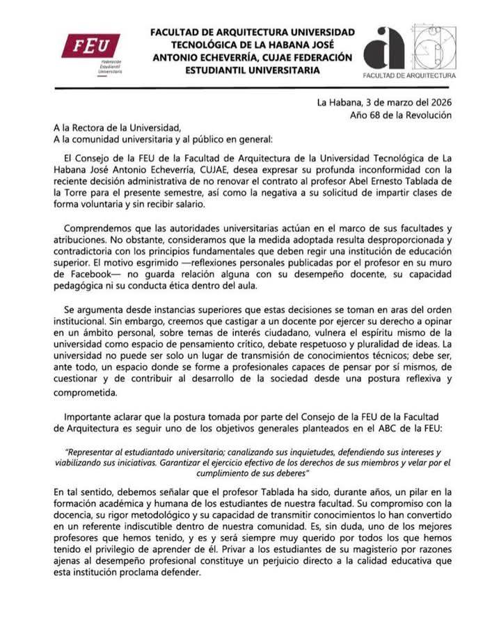 Una carta, a título del Consejo de la Federación Estudiantil Universitaria (FEU) de la Facultad de Arquitectura, confirmó que el motivo esgrimido contra él fueron sus reflexiones en redes.
