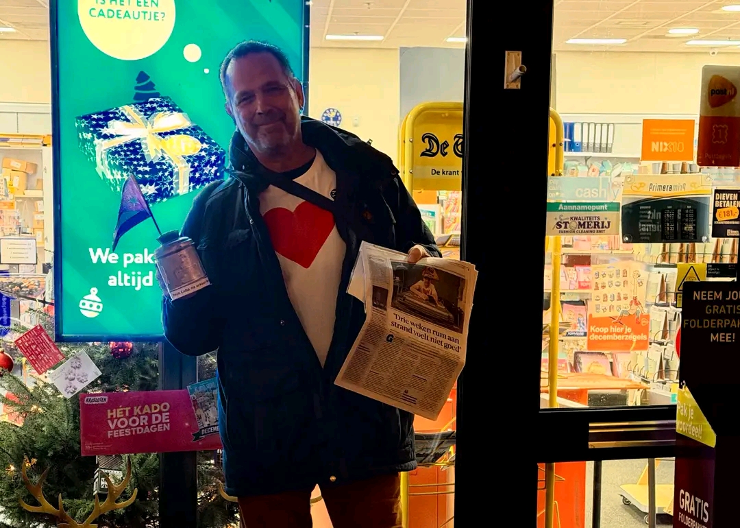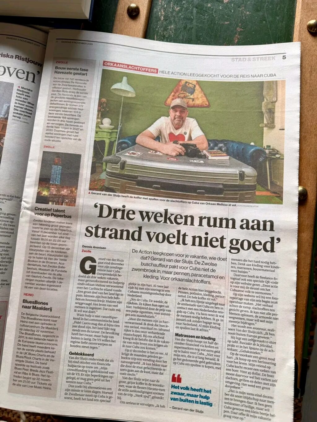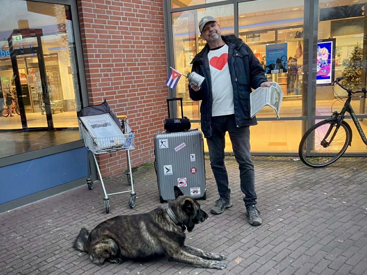 En las calles de Zwolle, con una pequeña bandera cubana, una alcancía en una mano, y en la otra un ejemplar del diario De Stentor, que lo entrevistó sobre su inciativa, Gerard viste un pulóver con un corazón rojo estampado en el pecho. En el artículo explica pacientemente a sus compatriotas los objetivos de la campaña. “Cada contribución, grande o pequeña, marca la diferencia”, nos dice apoyándose en un programa de traducción: aunque desea aprender español, solo habla neerlandés, inglés y alemán. A sus pies, Bram descansa.