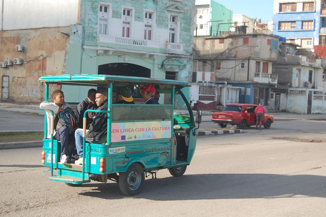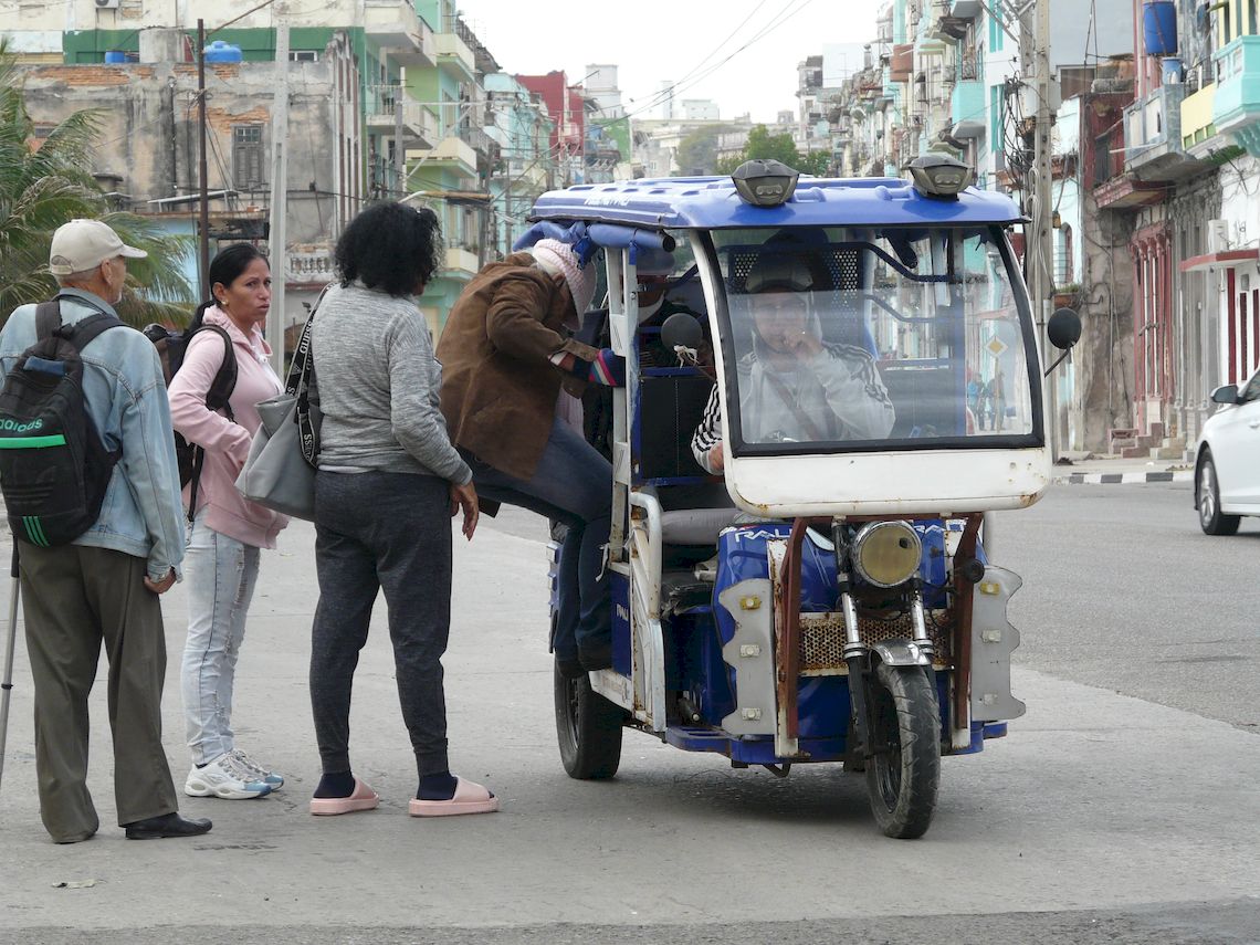 “No pasan guaguas, solo los triciclos (privados y estatales), pero casi todos ya vienen llenos de La Habana. Son muy chiquiticos”, dice una señora con gafas de sol, pamela y una bolsa transparente del Corte Inglés repleta de tomates rojos. Vive “por La Palma”, en el suroeste de la ciudad, y trabaja en el Vedado como asistente en una clínica estomatológica.