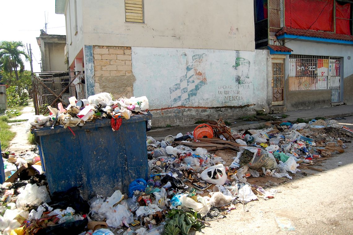 Por años, varios tanques plásticos, cual de ellos no descuartizado por tradición depredadora, se rebosan en un par de días o a lo sumo tres, y entonces los desechos ocupan el parterre y avanzan indetenibles hacia la calle, casi llegando a convertirse en barricadas naturales. Poco ha faltado para que la vía quede estrangulada por los desechos, que terminan siendo evacuados por las palas de la topadora, ese férreo caballo de Atila que erosiona la acera, extirpa el ralo césped de los parterres y rompe con sus fauces algún que otro segmento de contén que se interponga.