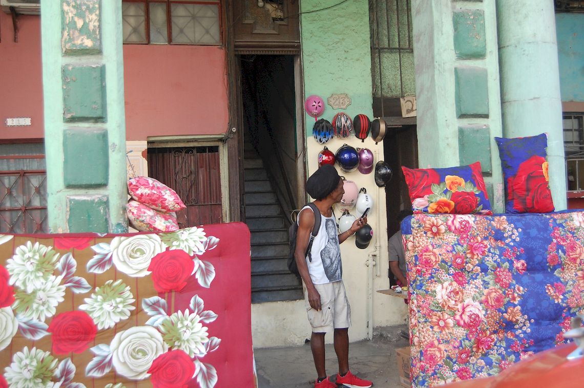 Venta de colchones, almohadas y cascos para motociclistas en la calzada de 10 de octubre . Foto: AMD.