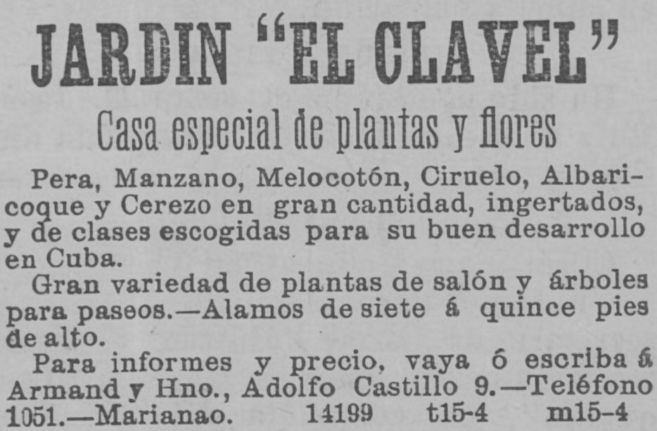 Por ejemplo, El Jardín, establecimiento de J. A. Armand sito en Domínguez esquina a Santa Catalina, Cerro, ofrecía en marzo de 1885 “toda clase de árboles frutales exóticos y aclimatados al país”. Hacia 1908, en la florería de Abundio García en Obispo 66 podían adquirirse plantones de melocotón, ciruela, higo, castaño, nogal, manzana y fresa. Una gama similar comercializaba S. H. Wilson en la Plaza del Vapor para agosto de 1924. Allí, por la entrada de Águila, vendía semillas en paquetes de diez centavos o por libras, y posturas traídas de España, injertadas, en su envase y con un metro de alto, a $2.50 el ejemplar.