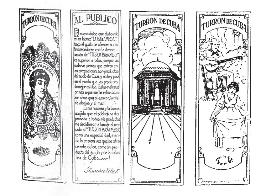 Otra decena de referencias aparece en el Boletín de Marcas y Patentes, de tirada anual. Por ejemplo, en 1920 se registra la Gran Fábrica de Turrones Superiores, turrones de alicante “expresamente fabricados para la isla de Cuba” por la acreditada casa La Estrella, de Vilaplana, cuya variedad de yema también fue bastante demandada. “Un sello de garantía” brindaba en 1925 La Bayamesa, de Manzanillo, que amparaba turrones de frutas, almendras y yemas. Un eslogan —firmado por Francisco Utset, dueño de la razón social— subía la parada: “El Turrón Bayamés es superior a todos, porque las materias primas que entran en su composición son productos del suelo de Cuba, y no hay país en el mundo que las produzca de mejor calidad”.