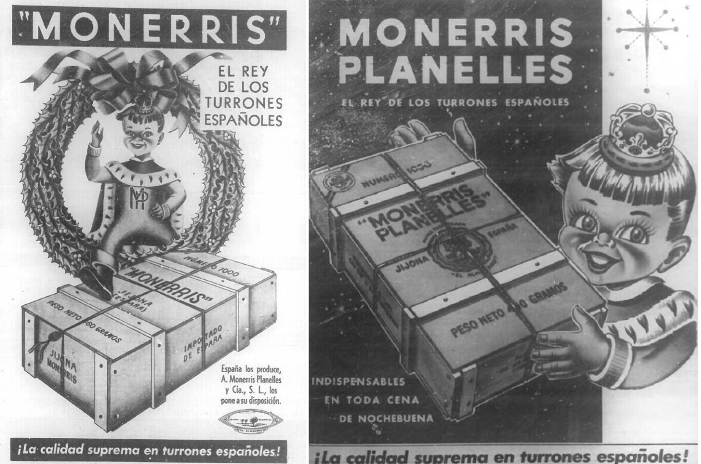 Otros de los turrones españoles más apetecidos fueron los Monerris Planelles. Venían en una cajita de madera que preservaba su sabor y frescura, y con sello lacrado. El Diario de la Marina del 13 de diciembre de 1928 informaba que, con motivo de la tradicional cena de Nochebuena, había arribado el vapor Marqués de Comillas con una carga de “los legítimos turrones de W. Monerris, inimitables por su finura”. Sus menciones publicitarias solían cerrar con la sugerencia: “Pídalos en su establecimiento favorito”. Entre otros sitios, podían adquirirse desde 1930 en La Casa Grande y La Casa Potin.