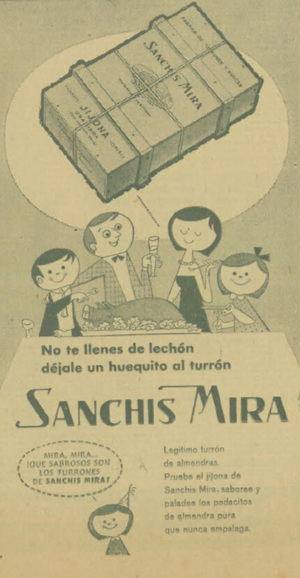 En 1868 Vicente Sanchis y María Teresa Mira abrieron una manufactura de turrones en la misma localidad, donde todas las casas huelen a miel. El matrimonio elaboraba el turrón de forma manual y se trasladaba a Barcelona a venderlo en un portal de Las Ramblas. La visión corporativa creció y decidieron probar suerte en Cuba. Con los años, Rafael Sanchis Mira, hijo de ambos aplatanado en la Calzada Vieja de Guanabacoa, llegaría a producir por toneladas turrón de maní con miel de caña. “No te llenes de lechón, déjale un huequito al turrón Sanchis Mira”, fue una de las simpáticas propagandas que la compañía sembró en el imaginario social.