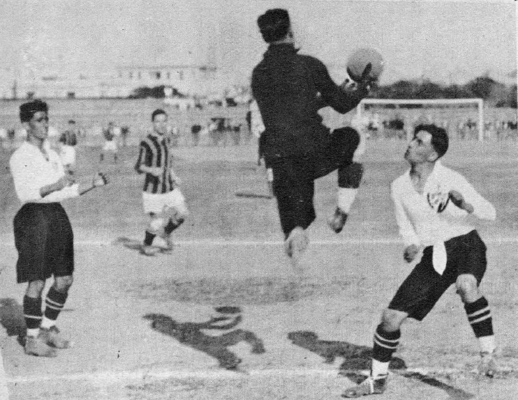 El portero galaico realiza una parada en el juego contra la selección Blanca, que resultó fácilmente derrotada por los visitantes. Foto: Carteles, 28 de febrero de 1926.