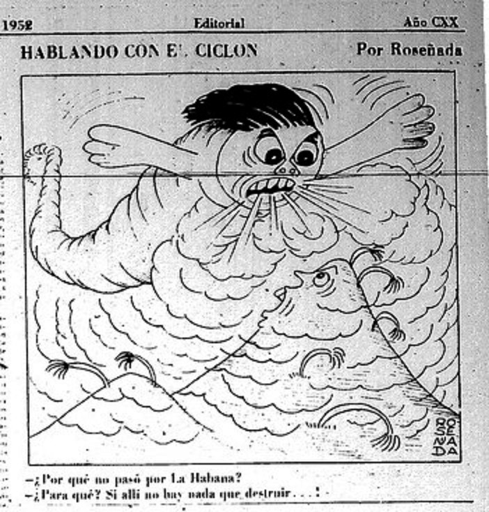 Desde el primero del que se tienen noticias por estos lares —la tormenta que en junio de 1494 sorprendió a Colón en las inmediaciones de la hoy Isla de la Juventud— hasta la actualidad, los ciclones tropicales —agentes señeros en la biografía del Caribe— han dejado su estela sombría, pero también su ángulo pintoresco. Incluso, en la lengua de algunos de ellos, el buen humor criollo ha afilado su cuchilla. Así, por ejemplo, se cuchicheaban las inmoralidades cometidas durante la distribución de las maderas para los damnificados del huracán de 1926, devenidas botín de las chusmas electorales; incidente vulgar que se repitió en 1944.