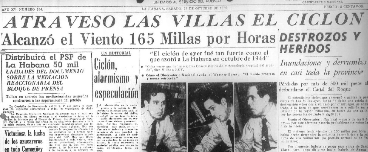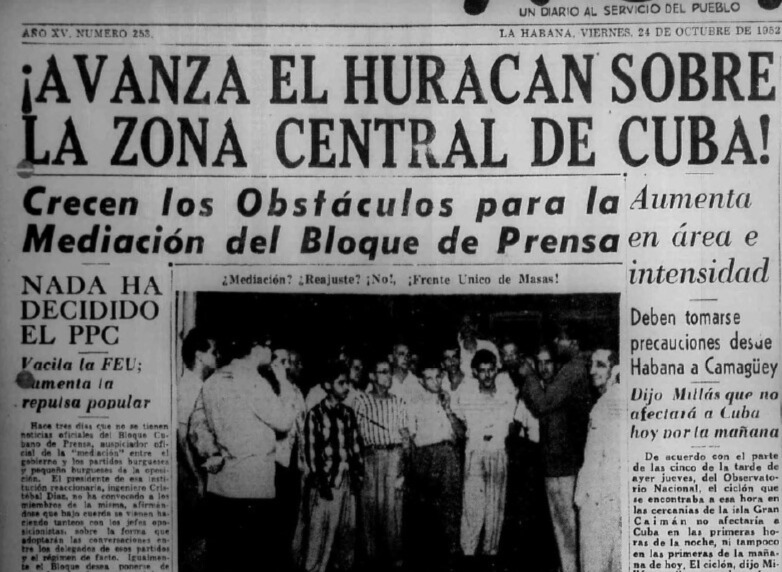 Mas el huracán del 24 de octubre de 1952 no estaba destinado a insertarse en el mapa de los recuerdos con gracia ninguna. Desde el jueves, los partes depusieron su tono de reserva y, con objetividad científica, certificaron la amenaza. La depresión se había vuelto huracán, con vientos de hasta 100 millas por hora y un claro movimiento de traslación en dirección a Cuba.