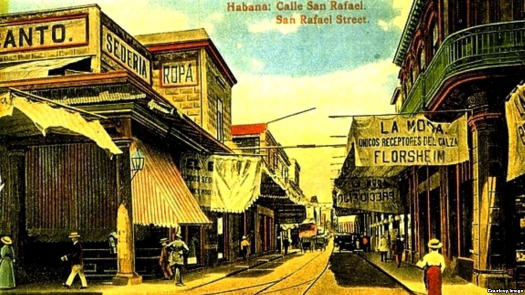 Panorámica de la calle San Rafael, en la que puede advertirse a la izquierda la sedería El Encanto de Solís y compañía. Foto: Patrimonio Documental. OHC.
