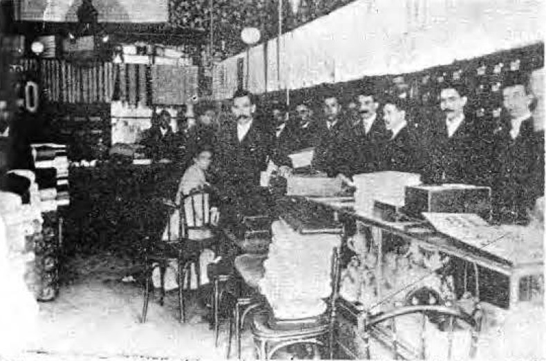 Curiosa fotografía en la que aparecen de conjunto los gerentes y empleados en el establecimiento antiguo. Foto: Revista Bohemia, 10 de abril de 1938.