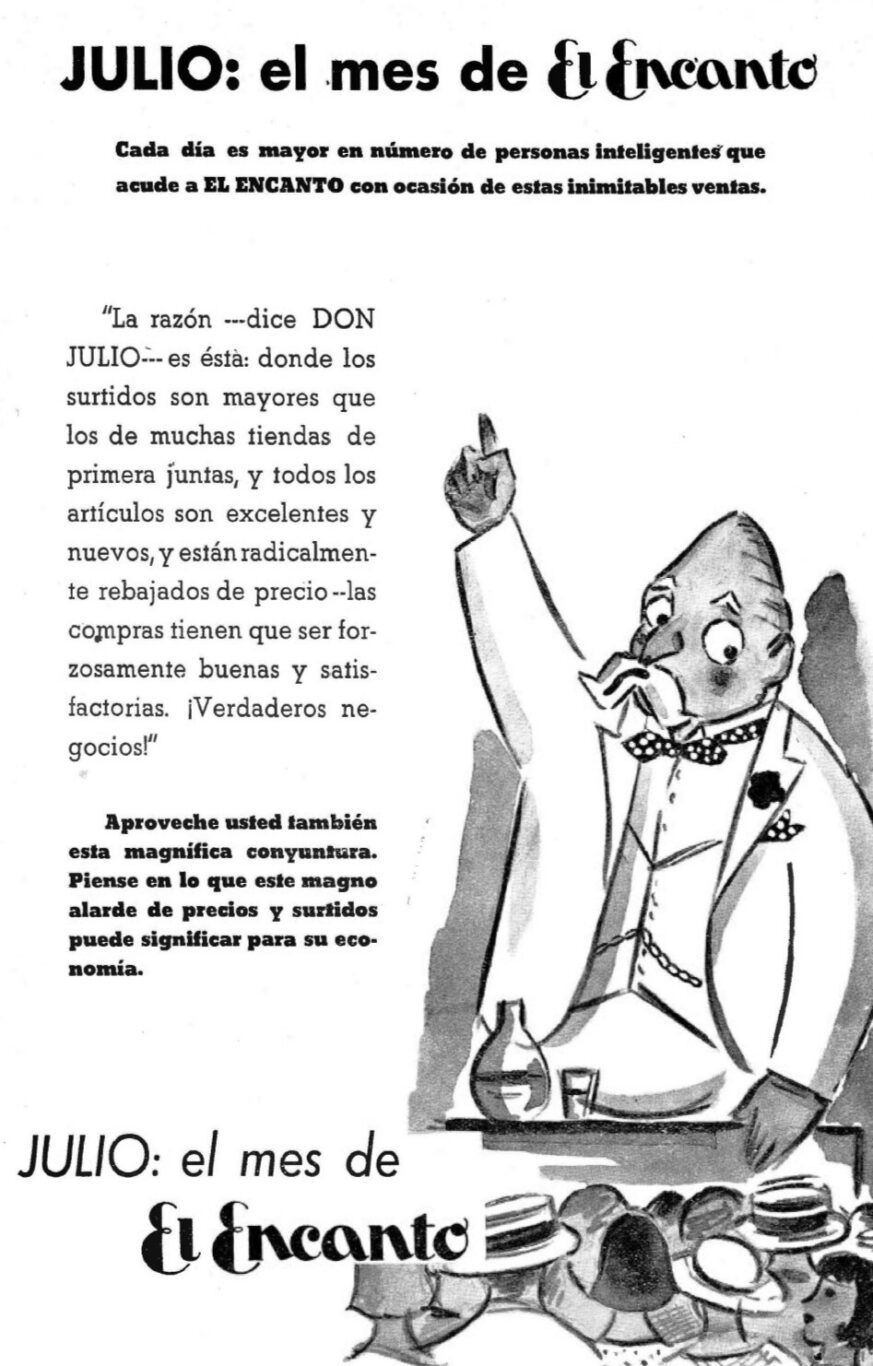 Un botón de muestra del marketing aplicado por la entidad es el personaje Don Julio, especie de Santa Claus de verano que traía “inimitables” rebajas de precios y hacía un “magno alarde” de surtidos. Foto: Revista Bohemia, 5 de julio de 1936.