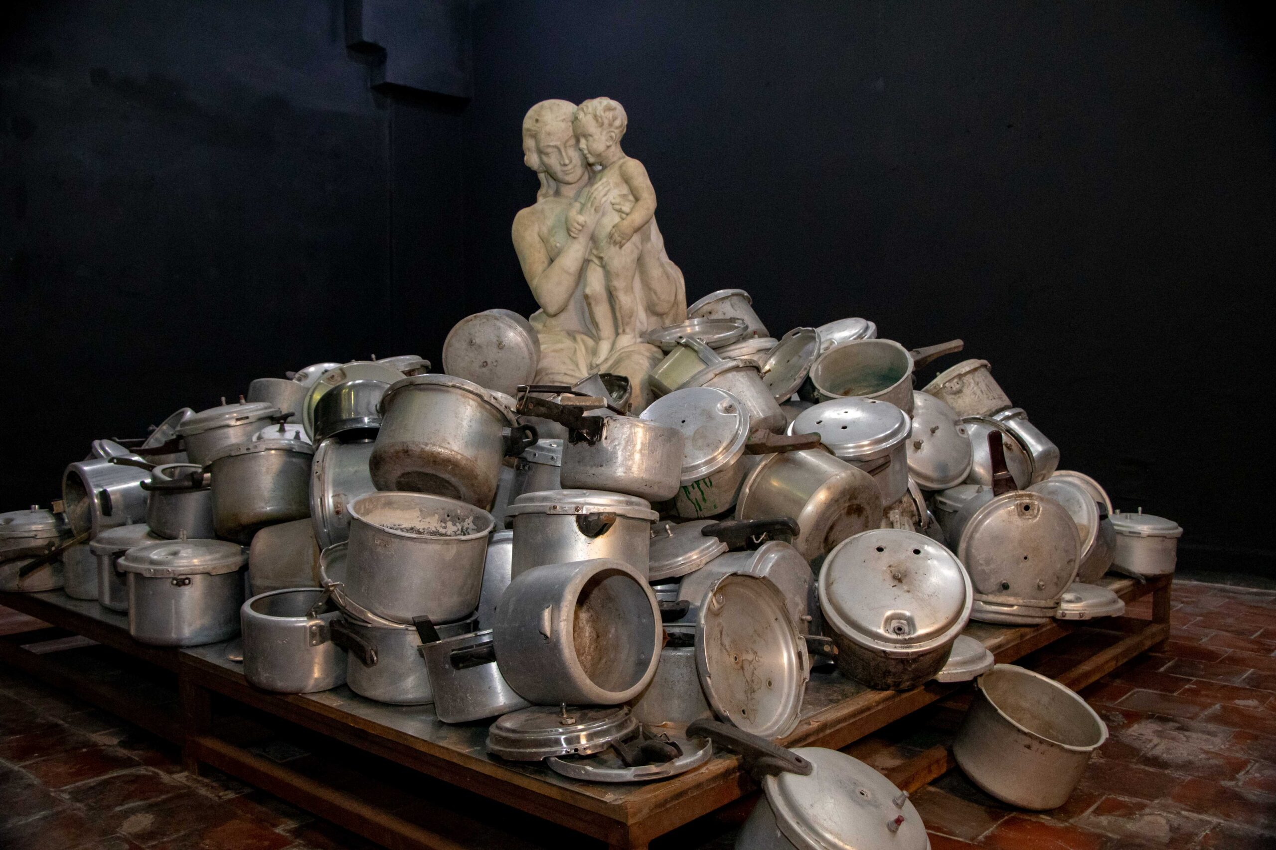 En el corazón de esta muestra late la obra “Día a día”, una instalación que es mi declaración de resistencia y resiliencia. Una obra que nació para hablar sin miedo: 469 ollas de presión usadas y tiznadas.