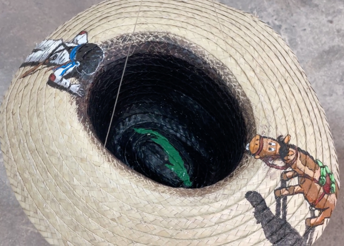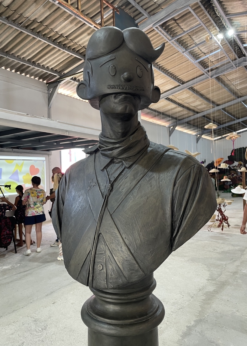 Ese espíritu juguetón convive y crece con otras piezas más conceptuales o informativas, como una línea del tiempo que trata los hitos en la historia del personaje, un busto que solemniza al mambi animado o una colección de sombreros intervenidos por distintas manos, muchas estéticas y mensajes.