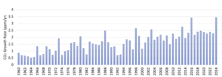 En la década de 1960, el CO₂ se acumulaba en la atmósfera a razón de 0,8 partes por millón cada año (esto es, aumentos anuales del 0,00008 %). Este crecimiento se triplicó entre 2011 y 2020, situándose en los 2,4 ppm anuales. Y la tasa de crecimiento de dióxido de carbono entre 2023 y 2024 ha ascendido hasta los 3,5 ppm, el mayor incremento anual desde que comenzaron las mediciones modernas en 1957.