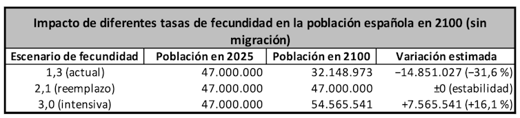 En el caso español, el contraste es claro. La tasa de fecundidad se sitúa desde hace años por debajo de 1,3 hijos por mujer, muy lejos del umbral de reemplazo generacional (2,1). Sin flujos migratorios constantes, España perdería millones de habitantes en las próximas décadas, con efectos directos sobre el sistema fiscal, las pensiones y el empleo. Según proyecciones del INE y de Naciones Unidas, de mantenerse la fecundidad actual sin migración, la población podría descender hasta 30 millones en 2100, frente a los 47 millones actuales.