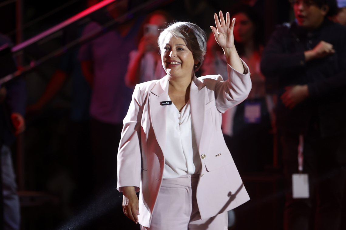 La candidata a la Presidencia de Chile por el partido Unidad por Chile, Jeannette Jara, saluda durante el evento de cierre de su campaña este miércoles, en Santiago de Chile. Foto: EFE/ Elvis González.