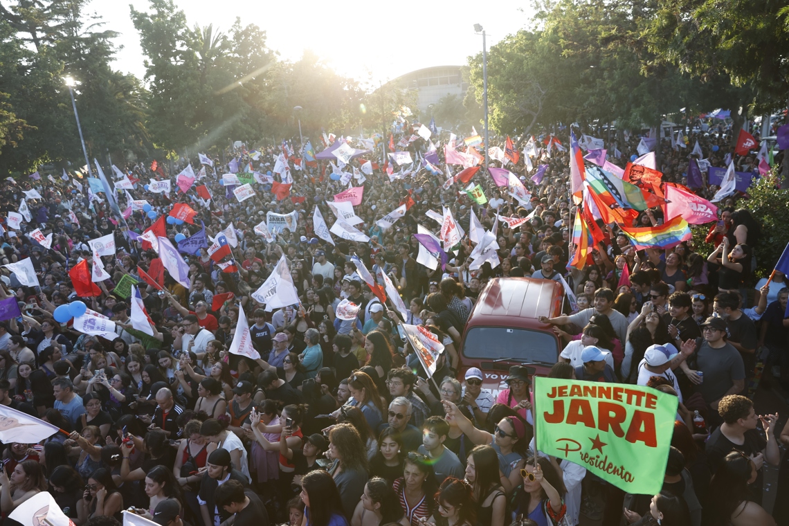 Simpatizantes de la candidata a la Presidencia de Chile por el partido Unidad por Chile, Jeannette Jara, asisten a un evento de cierre de campaña este miércoles, en Santiago de Chile. Foto: EFE/ Elvis González.