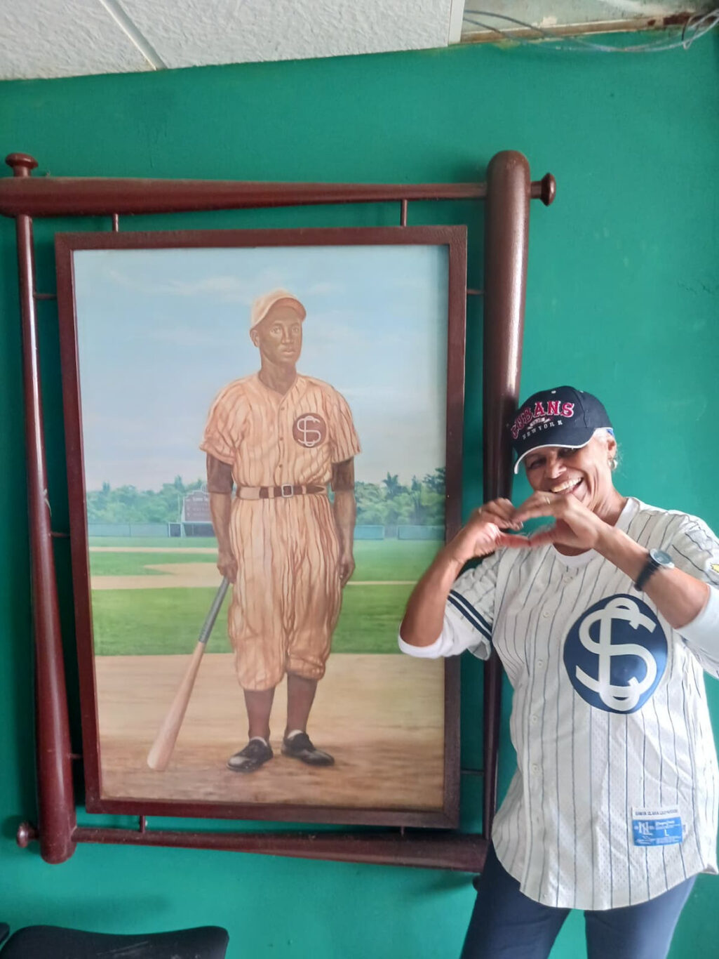 Maureen Taylor Hicks in front of a photograph of the great Cuban catcher Ariel Pestano, who participated in the meeting organized by the Cuba Foundation in Santa Clara. Photo: Courtesy of MTH.