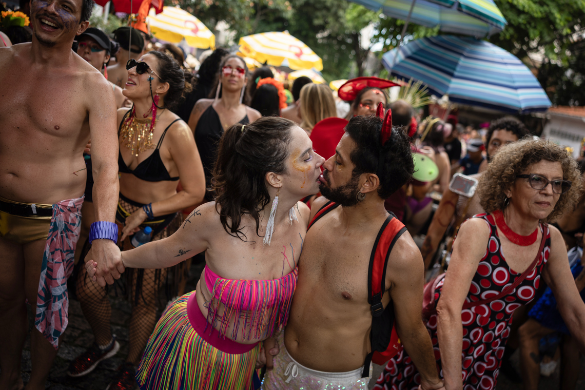 Personas se besan durante el desfile de la comparsa callejera Unidos do Swing este lunes, en Sao Paulo (Brasil). Foto: EFE/ Isaac Fontana.
