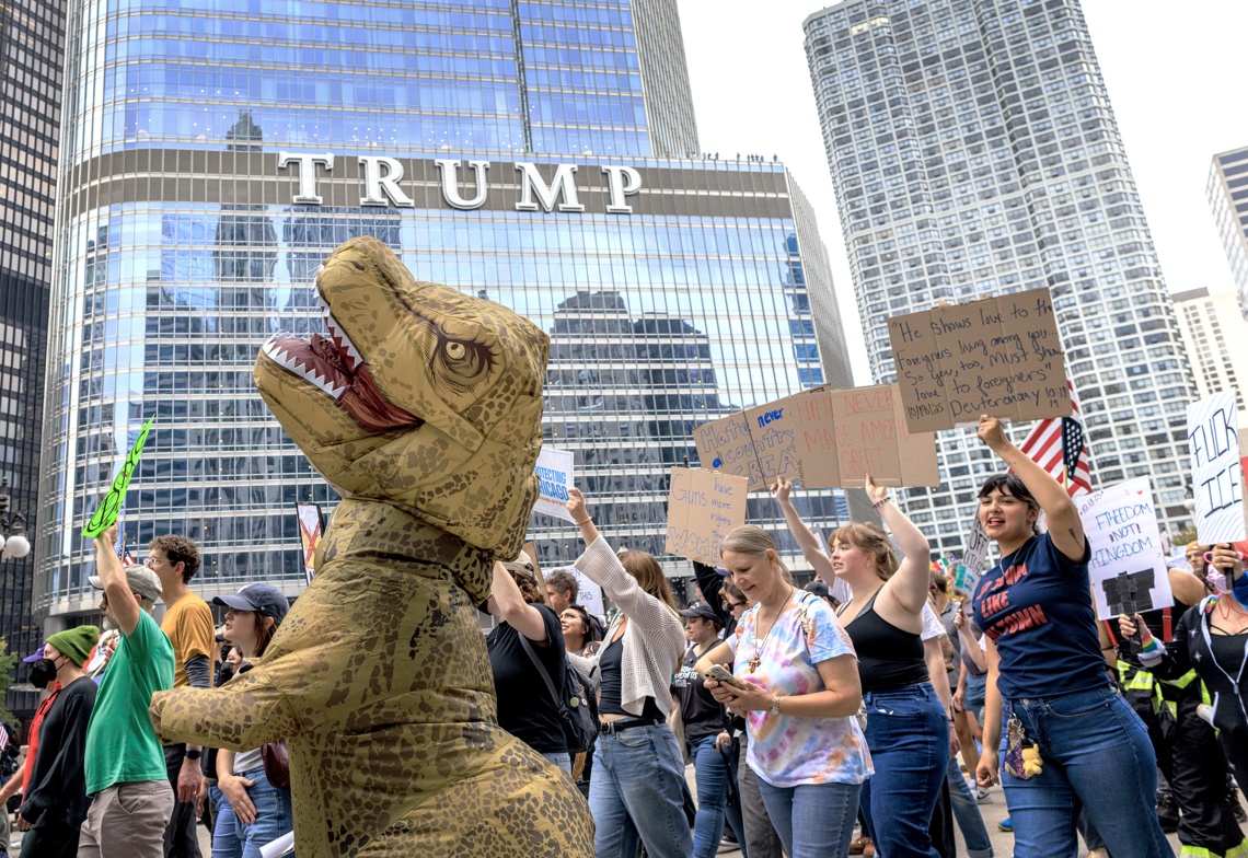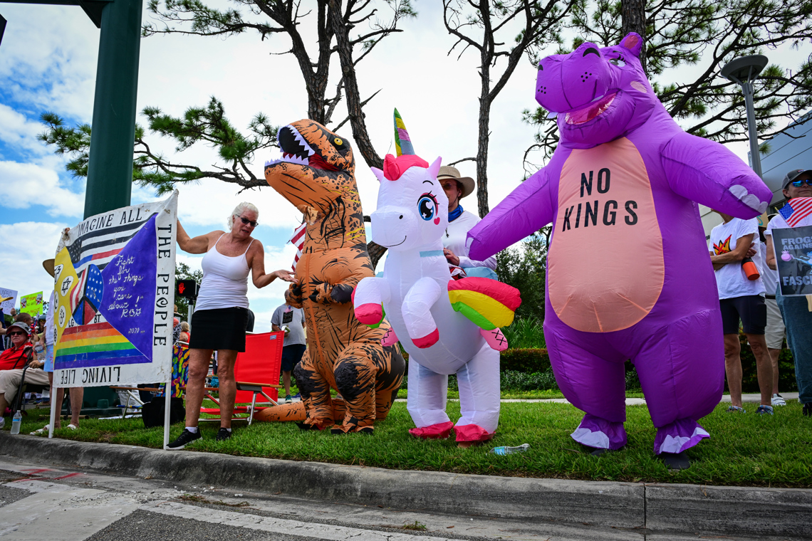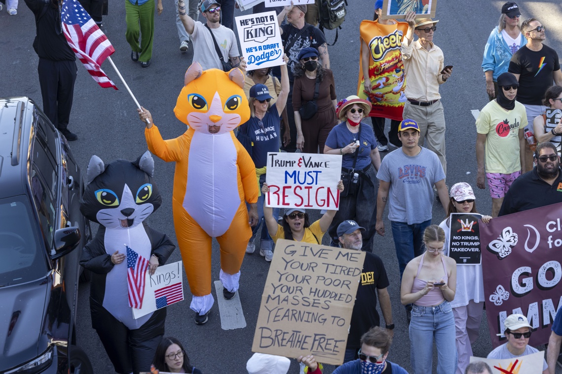 “Es muy difícil llamar zona de guerra a algo cuando lo que ves es una fiesta de barrio y gente en disfraces de Halloween”, dijo un manifestante de Los Ángeles mientras bailaba disfrazado de unicornio. Otros vestían trajes de pollos inflables, dinosaurios o ranas.