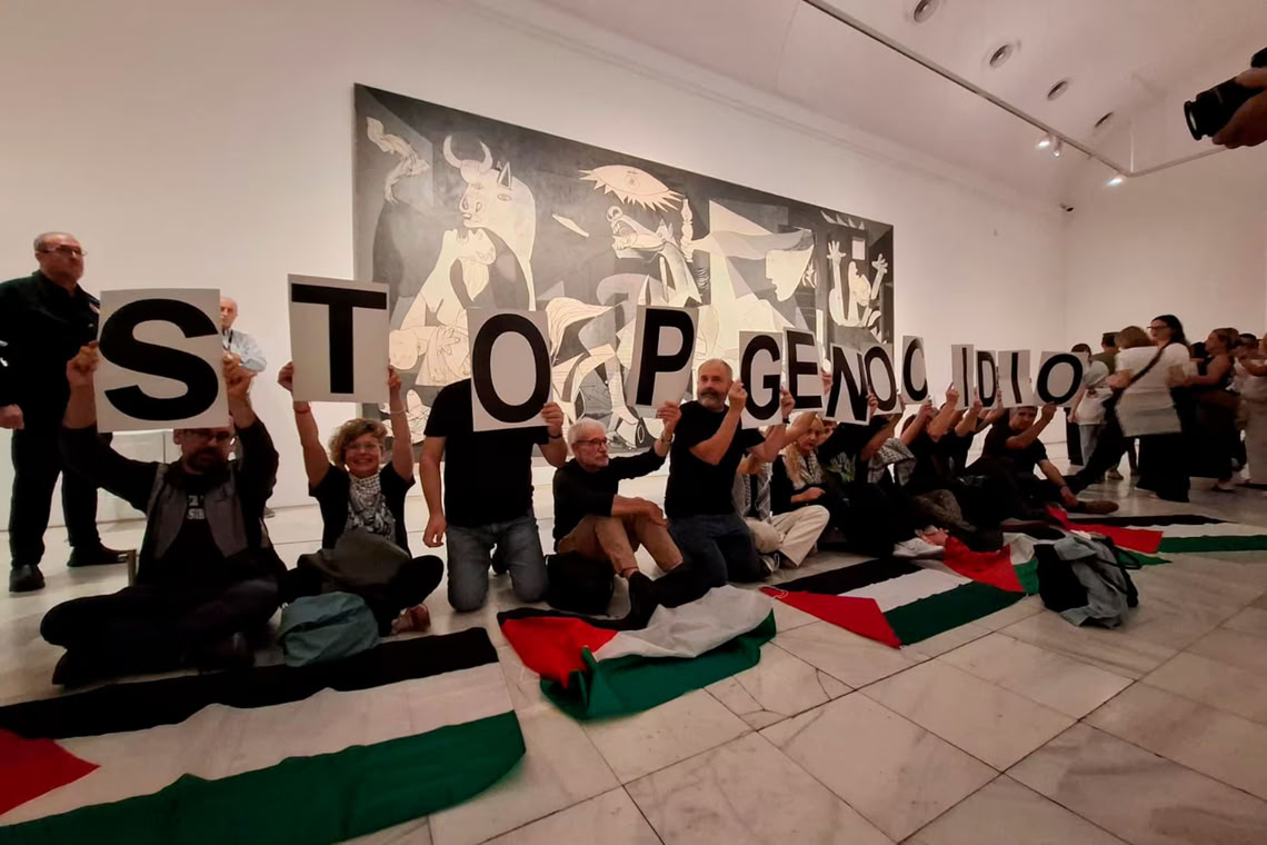 Una veintena de activistas de Marea Palestina realizaron una sentada frente al icónico Guernica de Pablo Picasso, portando carteles con la frase “Stop genocidio”.